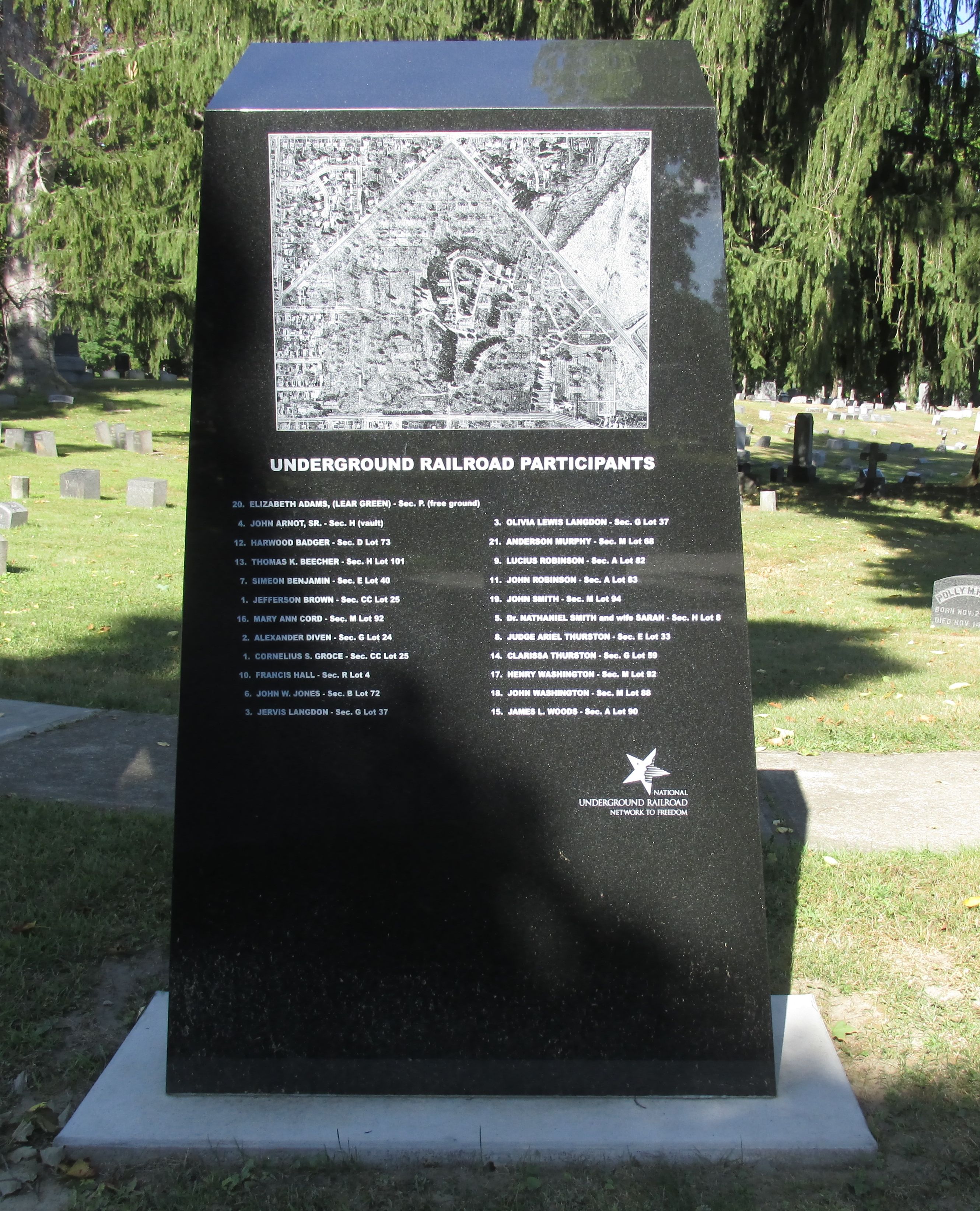 I looped back to the main road of the cemetery, still looking for a map or for more signs. I found this memorial to the participants of the Underground Railroad.