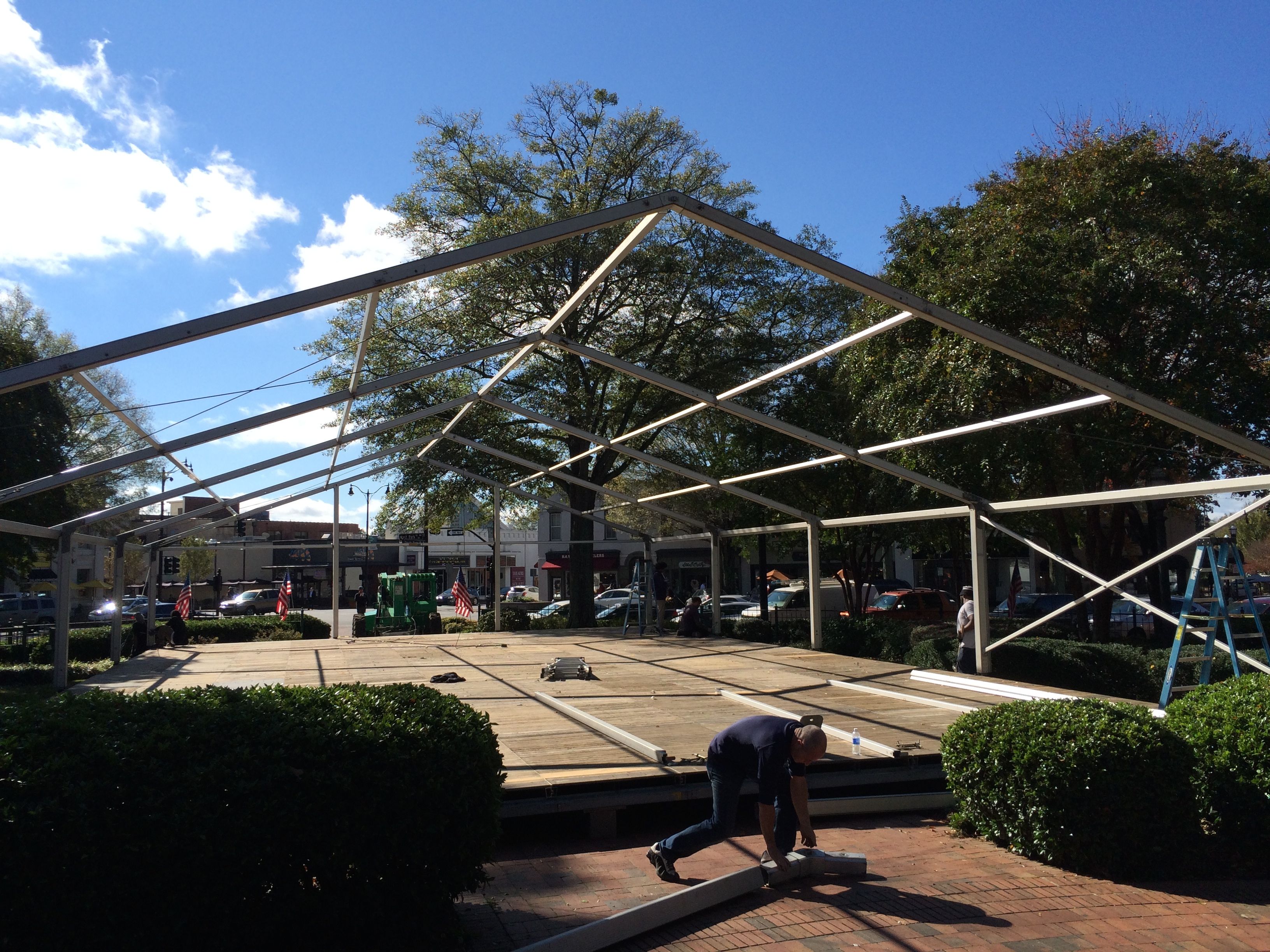 There were workers in the park getting ready for the holidays. They were erecting a skating rink! It looks like they are planning to have some fun there in Marietta.