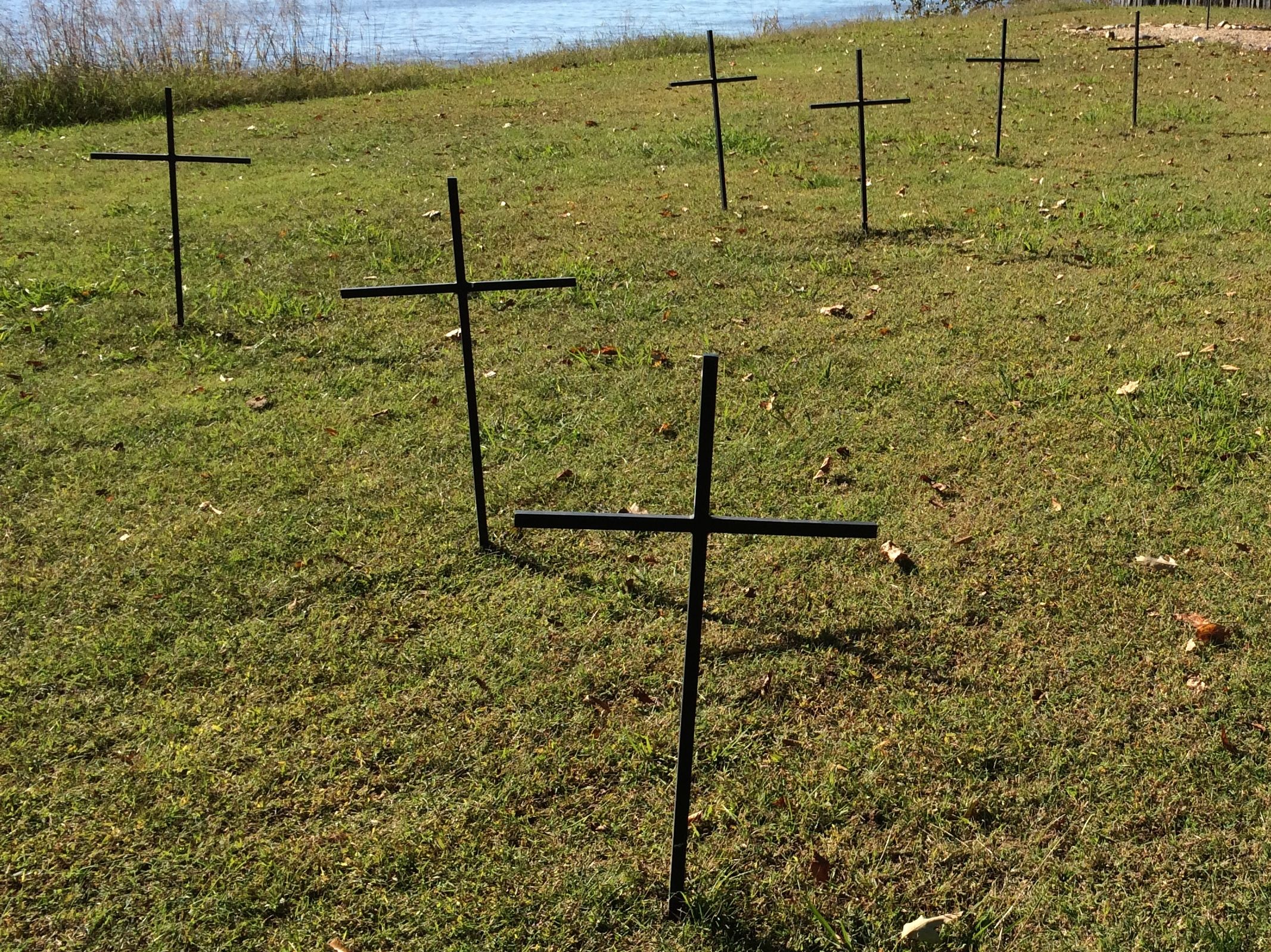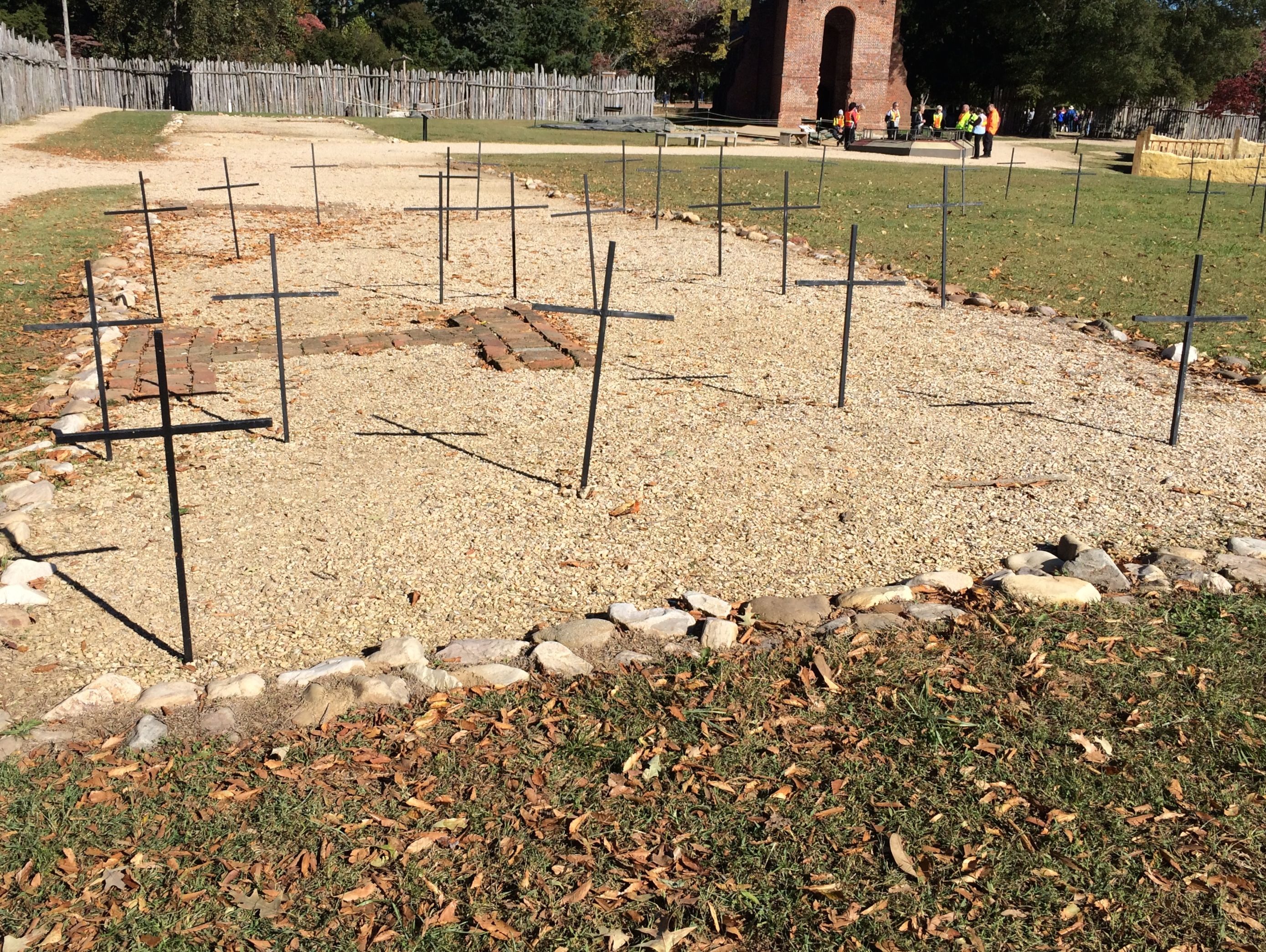 The archeologist – and I really wish I had gotten his name – said that he had these crosses made to mark the graves inside the fort when Queen Elizabeth came for the 400th anniversary. The graves had been marked with wooden crosses, which he said gave the grave an “Old West” feel, which wasn’t in keeping with the era. He said that they had some old wrought iron fence, so he had a welder use the fence to make these crosses.