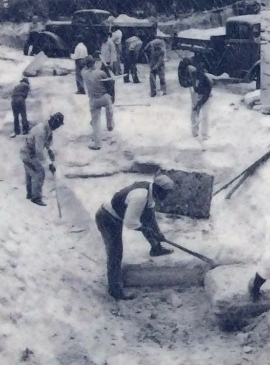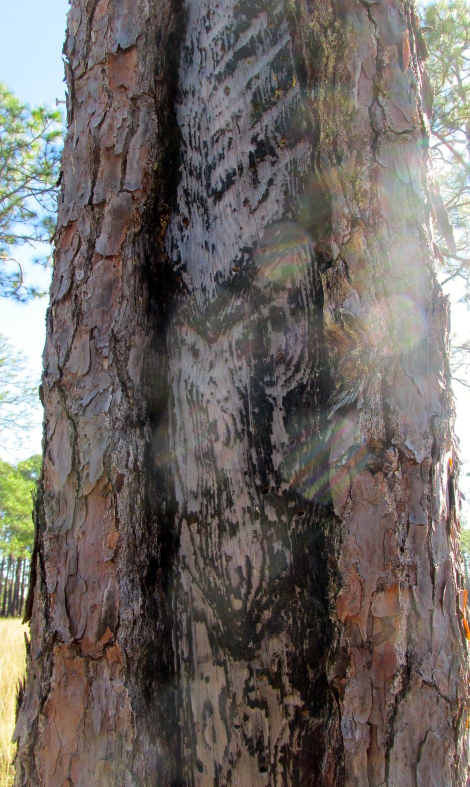 Here is a photo from 1937. The marks made on the trunk were called “cats faces.” They would collect the resin and distill it to create pitch. The pitch was used to caulk holes in wooden boats and to coat rigging to help it last longer. From what I have read, turpentine is a by-product of producing pitch.