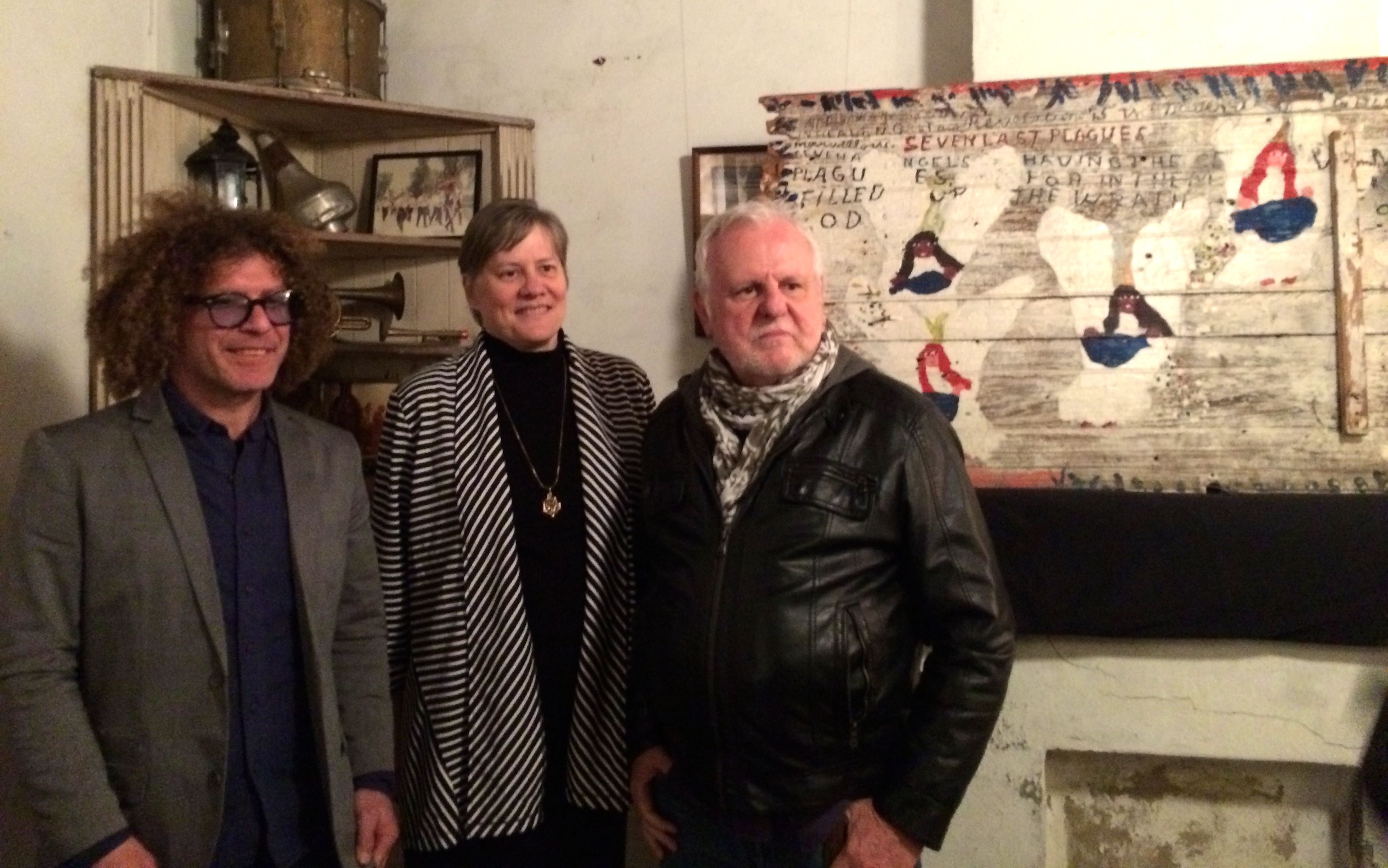 The man on the left of Lisa is Ben Jaffee, and he is the son of one of the founders of Preservation Hall. The man on the right of Lisa is William Fagaly, the curator of African Art. They are there to accept the work of art on the mantle, which is by Sister Gertrude Morgan. Her work contained religious topics and she painted as she felt directed to by God.