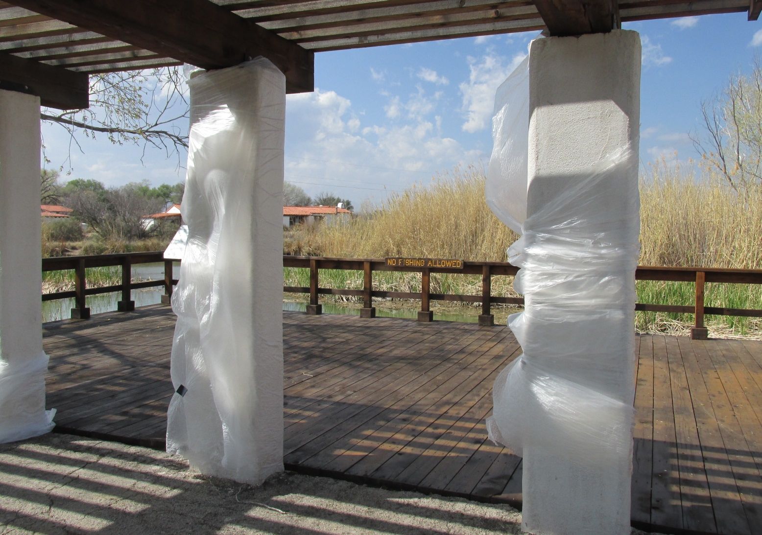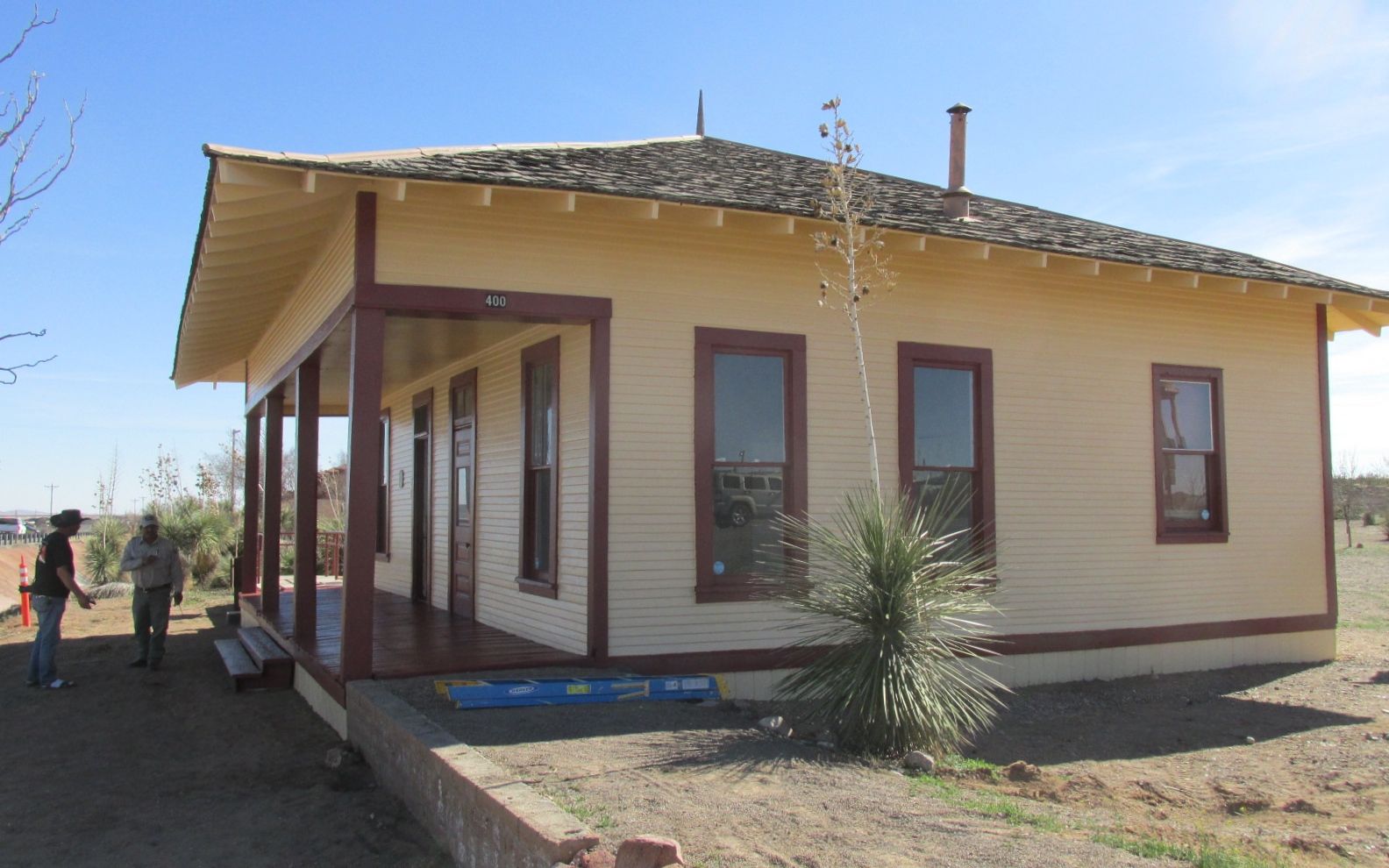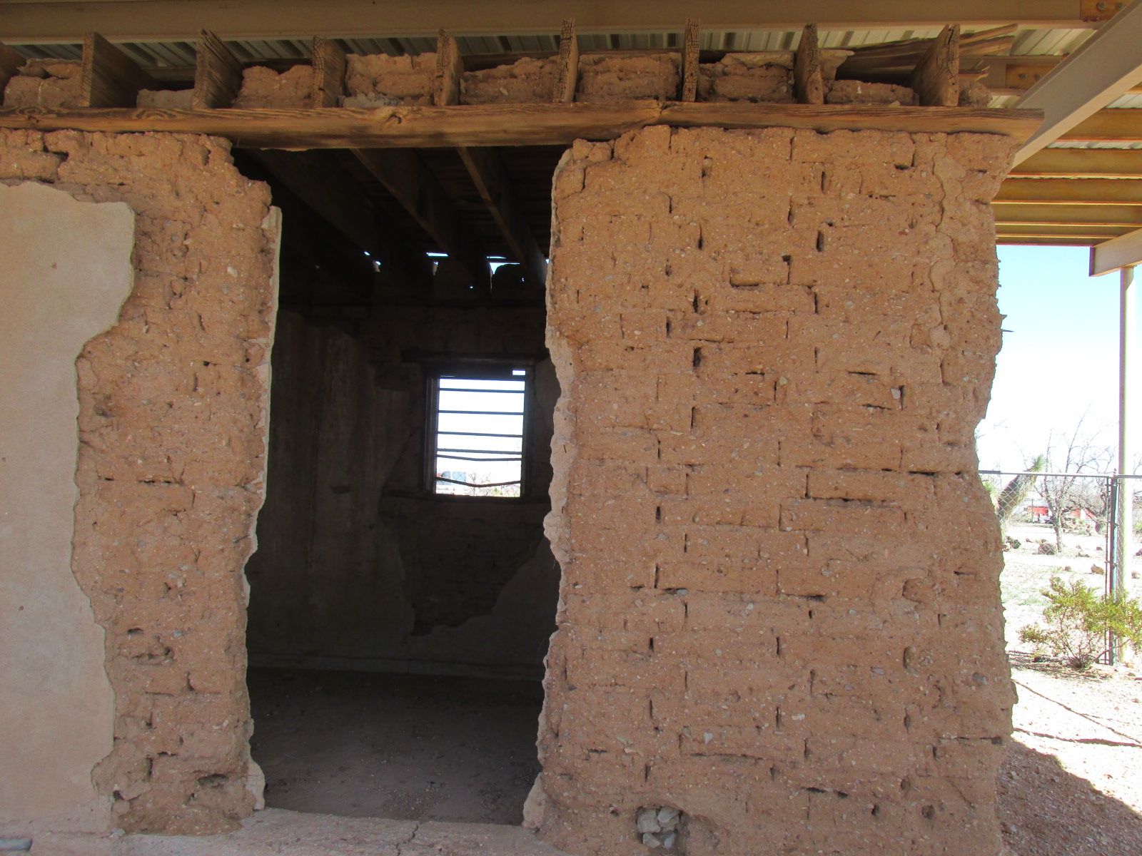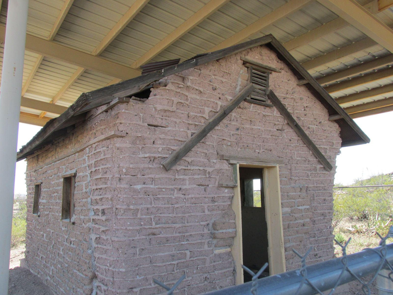Some of the original Camp Furlong buildings from before the raid still stand. The remains of adobe structures are protected by shelters.