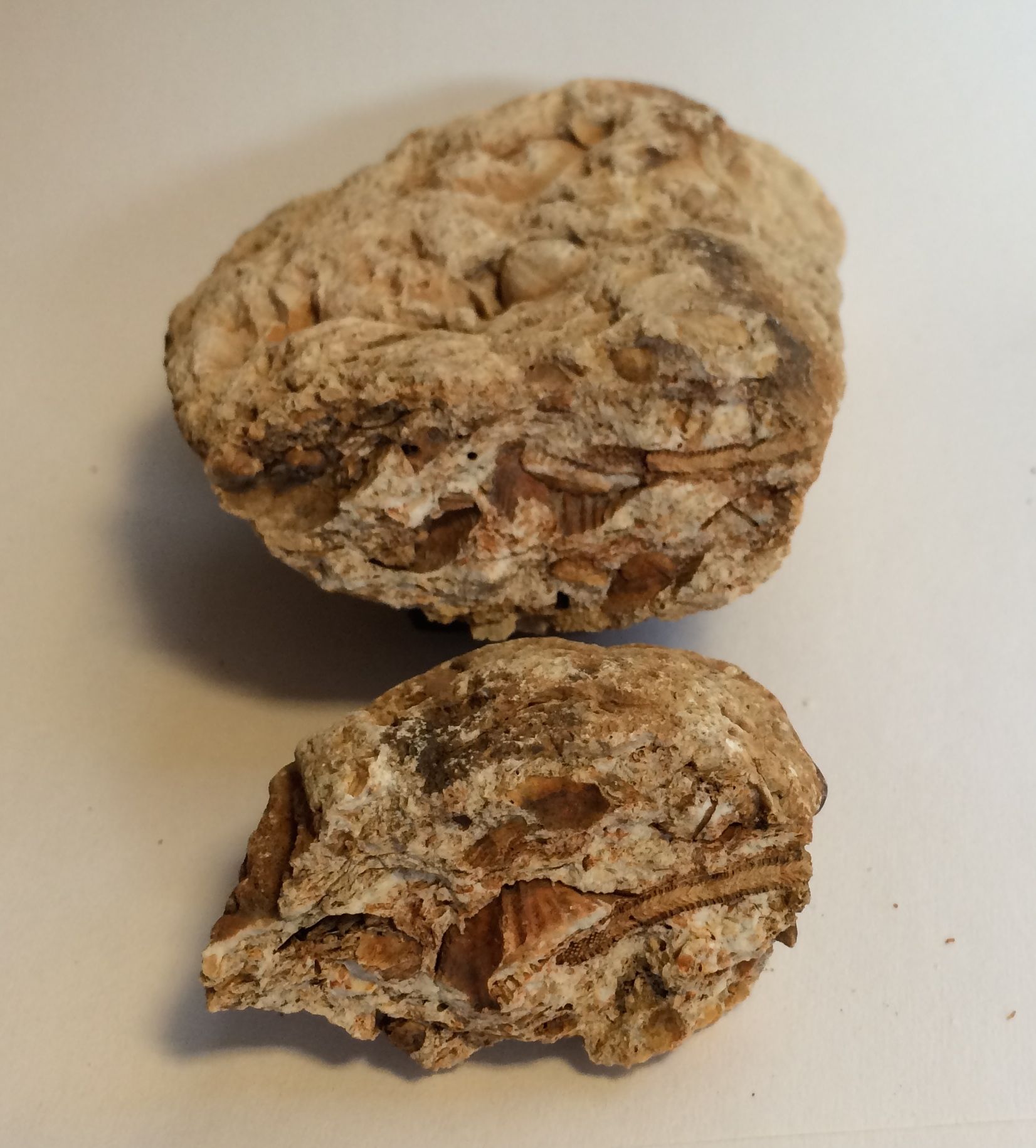 You could still see the shells sandwiched in with the other fossils in this piece. I saw a crack, so I snapped it apart.