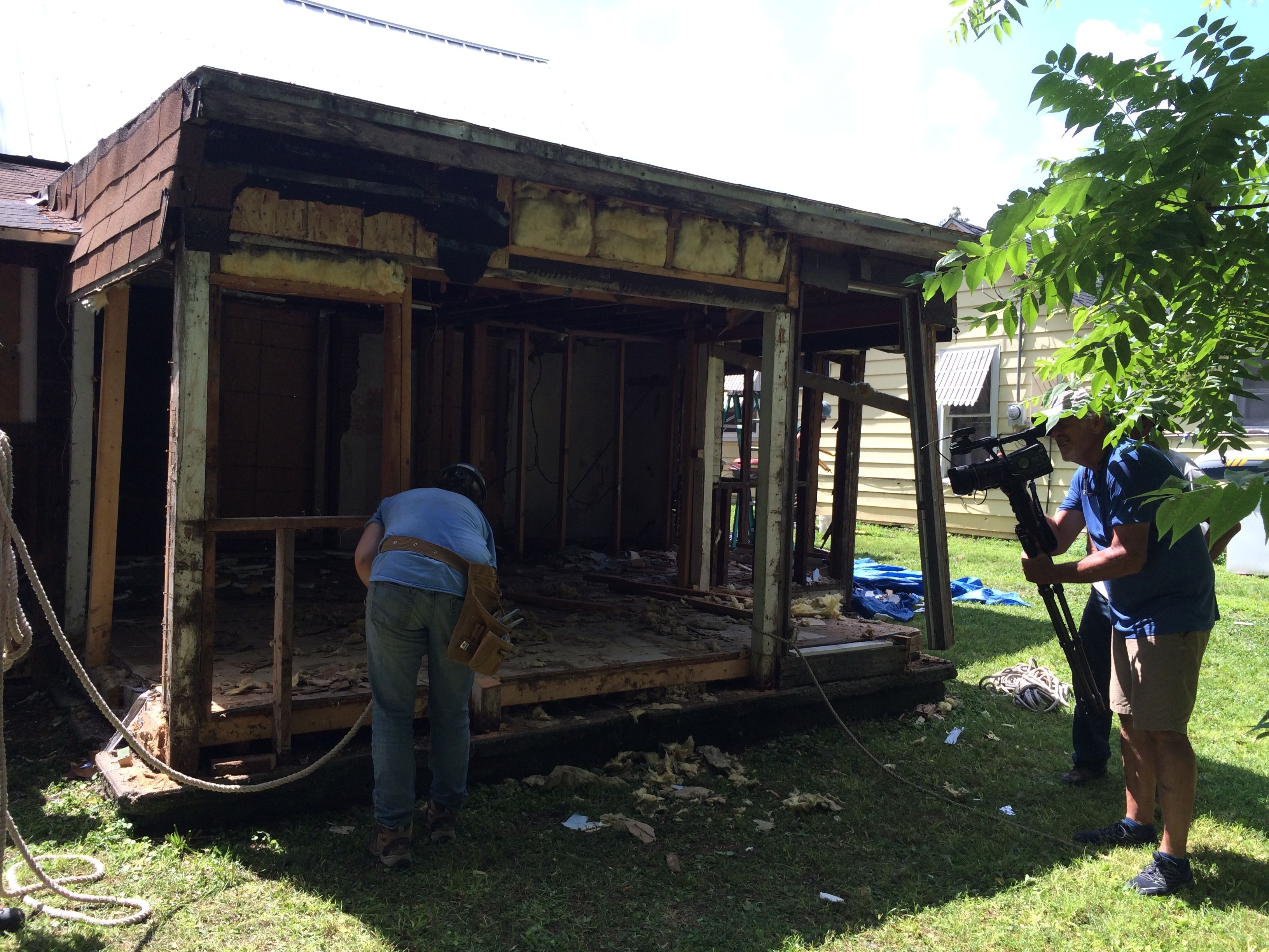 Our last task on day one was to collapse the additions. Here you can see the photographer documenting the job. The first thing we tried was pulling it down with ropes. Half of us got on a rope on the left side and the other half of us were on the right side. On the count of three, we pulled and we pulled. Nothing happened.
