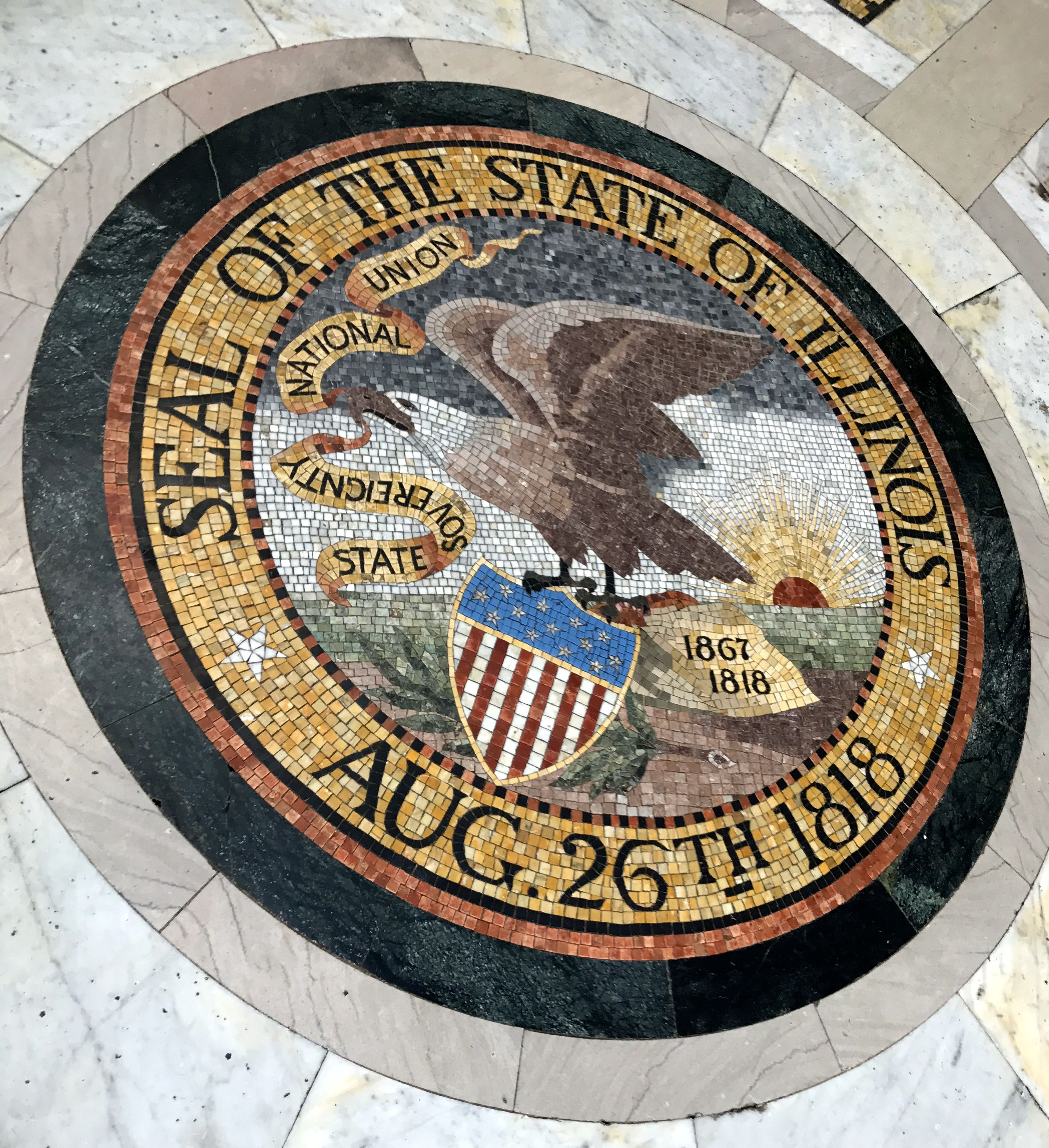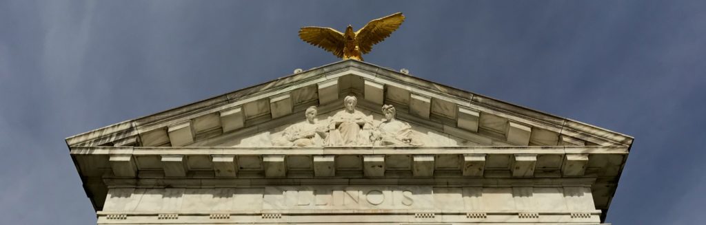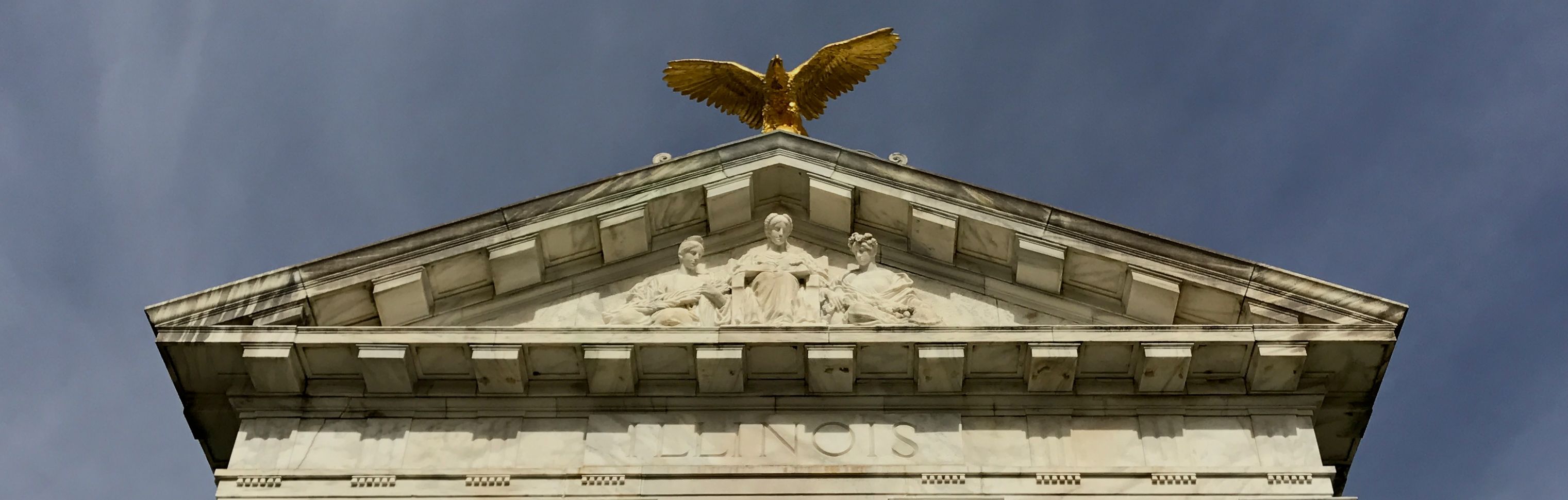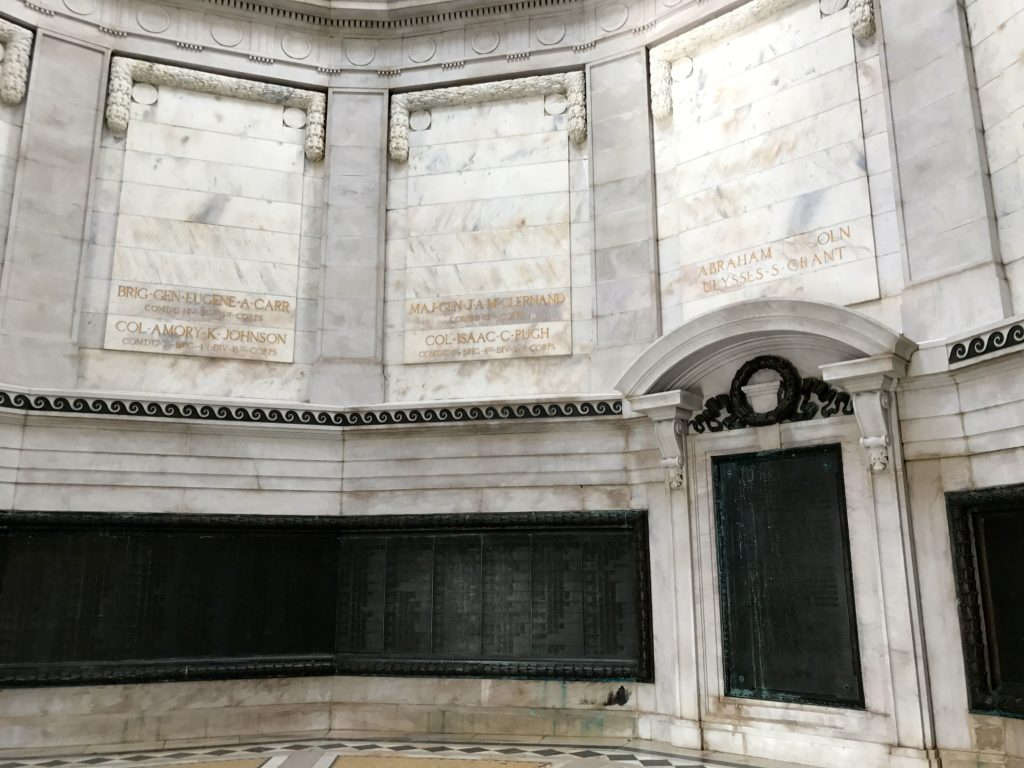 If you look carefully, about the arch over the tablet to the right, you can see the names of two prominent sons of Illinois, Abraham Lincoln and Ulysses S. Grant.