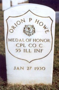 Orion P. Howe was a 14-year-old musician with the 55th Illinois Infantry. His unit was pinned down by enemy fire and running out of ammunition. He volunteered to run back and get more, but on the way he was wounded. He found General Sherman and asked for the needed cartridges.