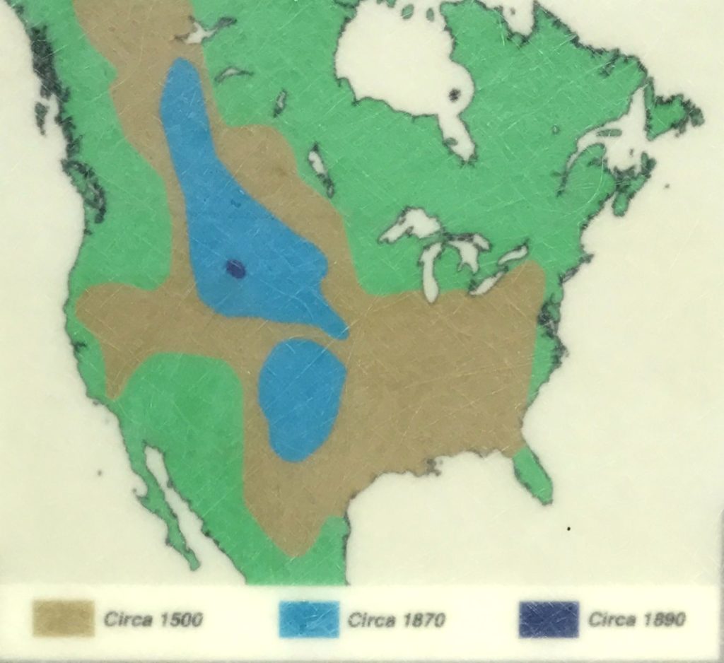 This map documents the shrinking range of the buffalo. The areas in bright green had none, so don’t worry about the fact that bright green isn’t represented in the key.