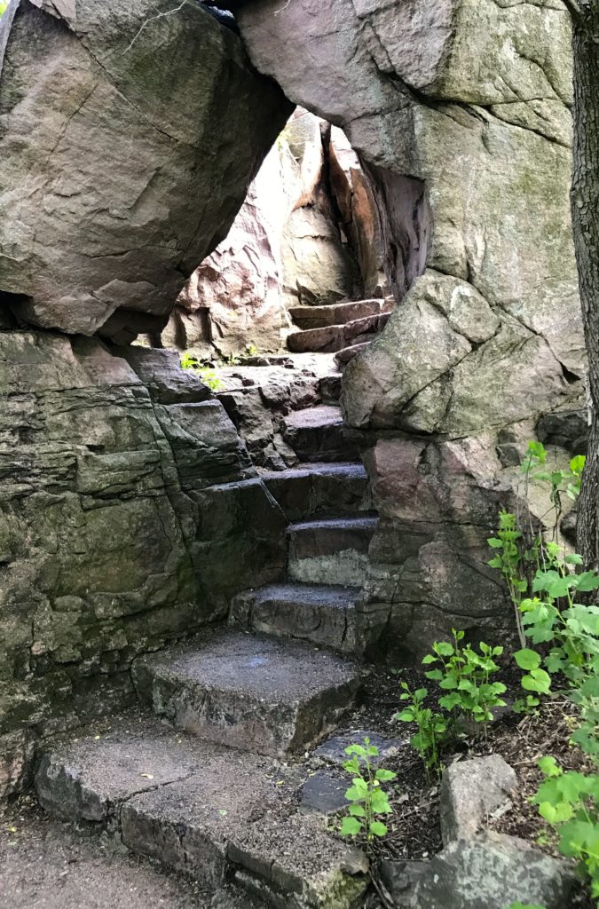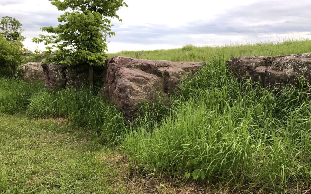These huge granite rocks seem out of place in this landscape filled with quartzite, don’t they? According to the information at the site, they were carried down from present-day Canada during the last Ice Age. When the glacier receded, it left behind a huge boulder about 30 feet in diameter. The freeze/thaw cycle eventually split this glacial “erratic” into six pieces.