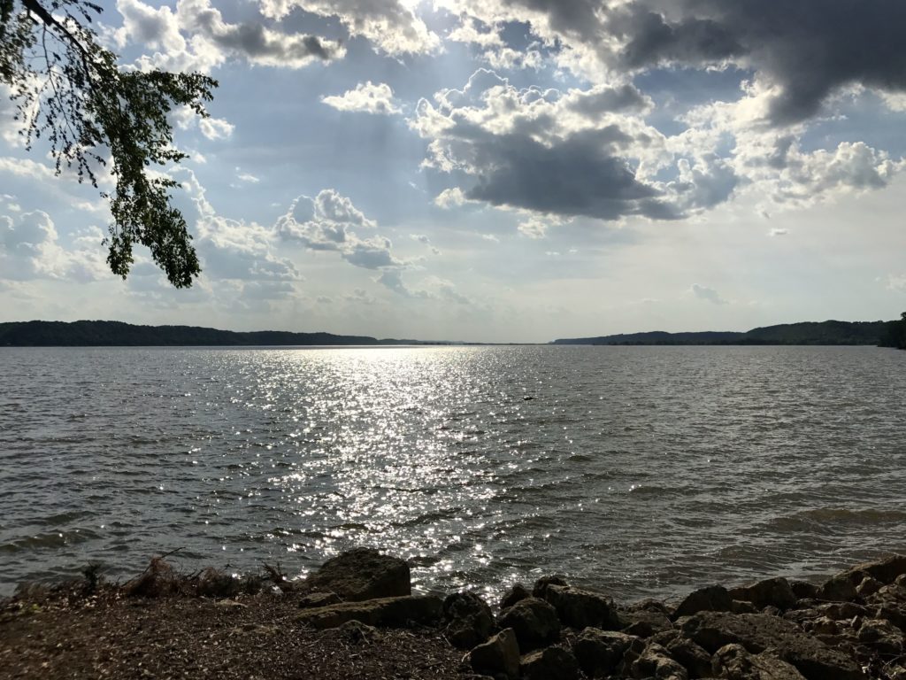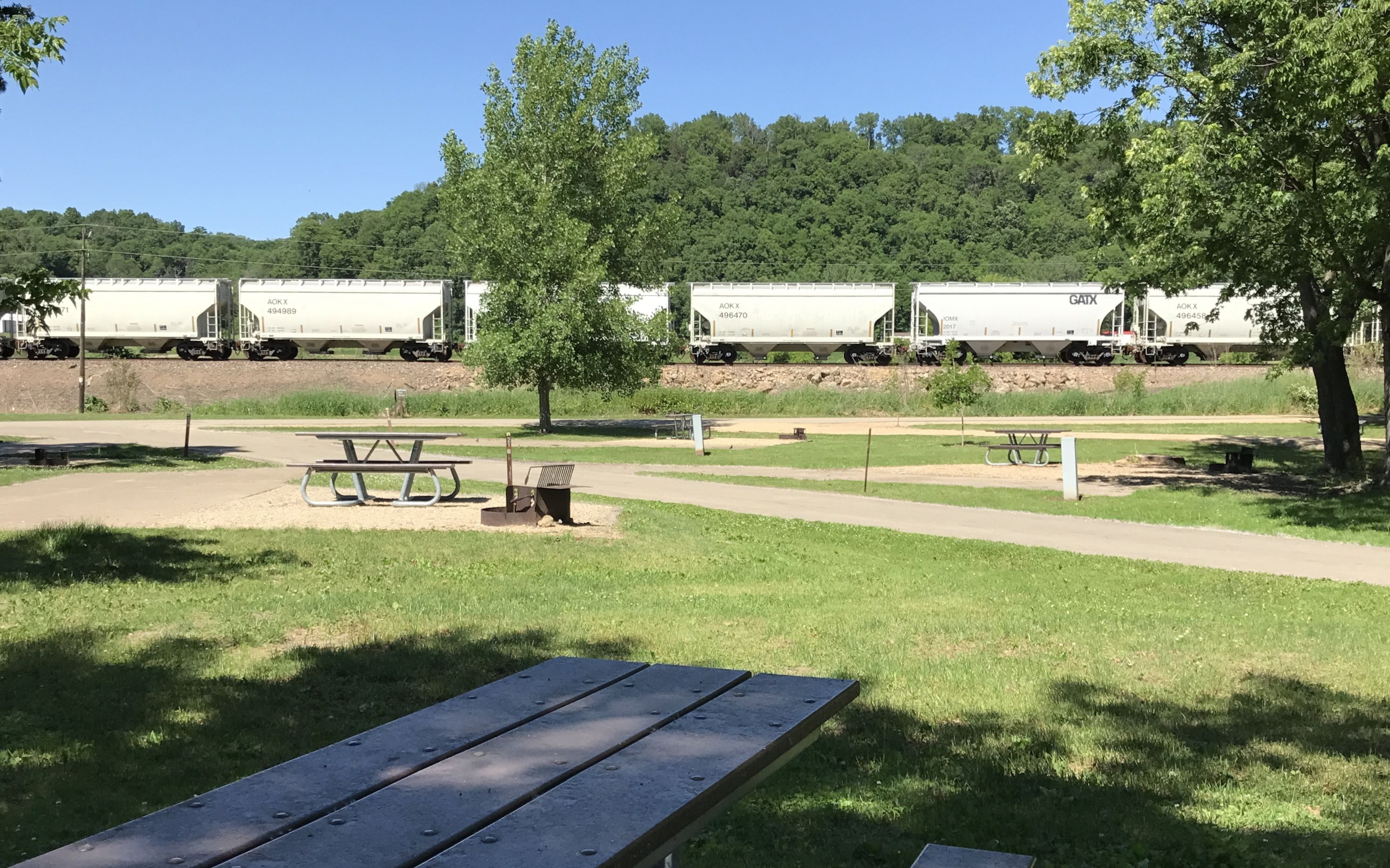 After a quick break I headed off for the day’s destination, Grant River Recreation Area. In spite of the name, it is on the Mississippi River. I was a little leery of the signs that proclaimed “rustic road”. Curvy, rustic roads with a 27 foot trailer are not my favorite thing. But the trip down the rustic, curvy road was worth it. This was an Army Corps of Engineers campground and it was lovely. My site was just a short stroll from the banks of the mighty Mississippi.Of course, train tracks many times follow river beds. My site was quite close to the railroad right of way.