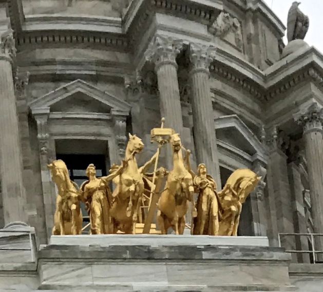 The name of this sculpture is The Progress of the State. It was sculpted by Daniel Chester French and Edward Clark Potter. French is probably one of the most well-known sculptors of his era, as he also is responsible for the Lincoln statue in the Lincoln Memorial. Potter’s work is also well known, even if his name is less so. He was well-known for his equestrian and animal statues. His most famous works are the marble lions in front of the New York Public Library, Patience and Fortitude.