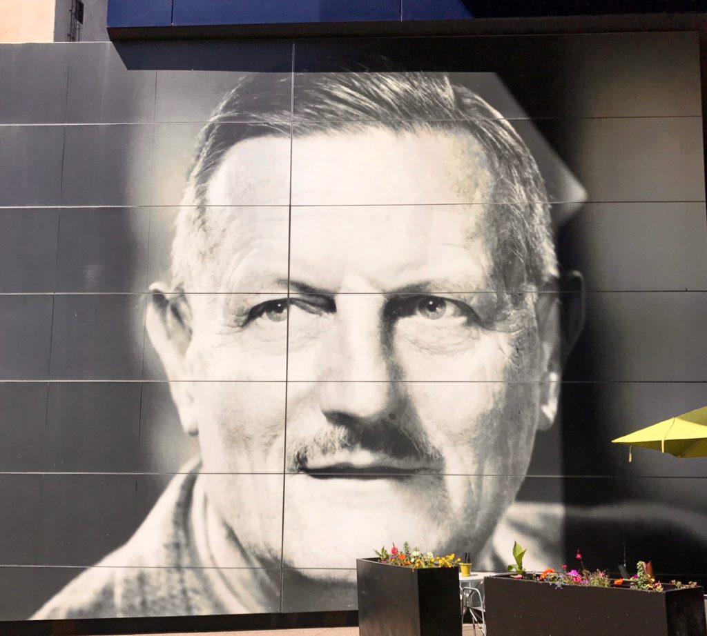 I passed the large portrait of Sir Tyrone and through the entrance. This is quite the sculptural building – and so monochromatic.
