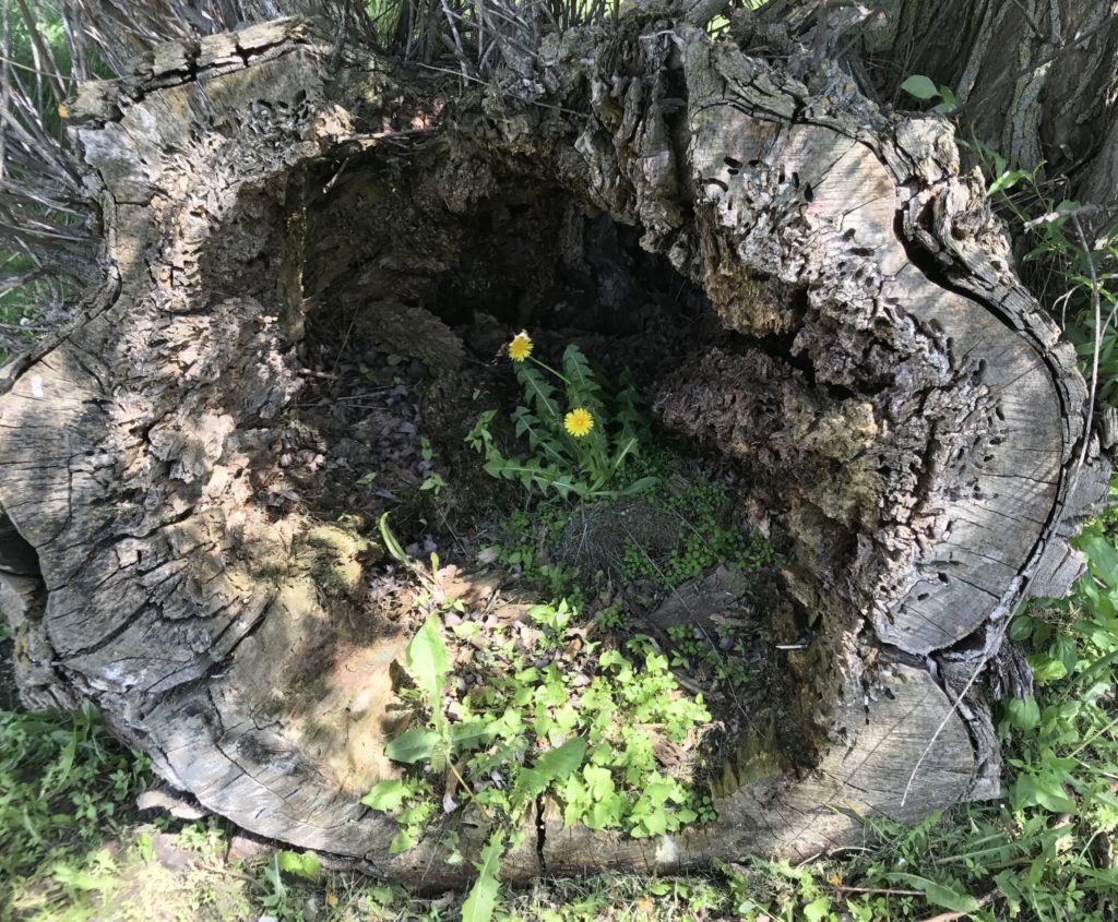 I walked around a bit. I had to admire this tough old tree. Down, but still sending out shoots and leaves.