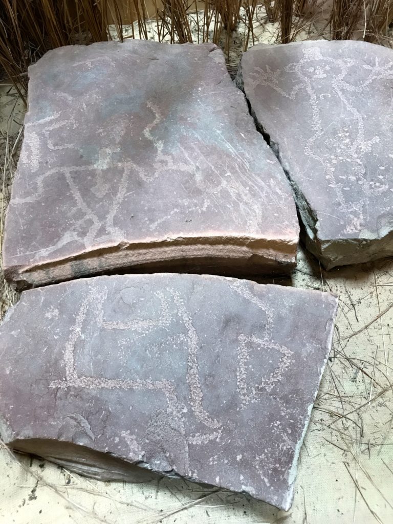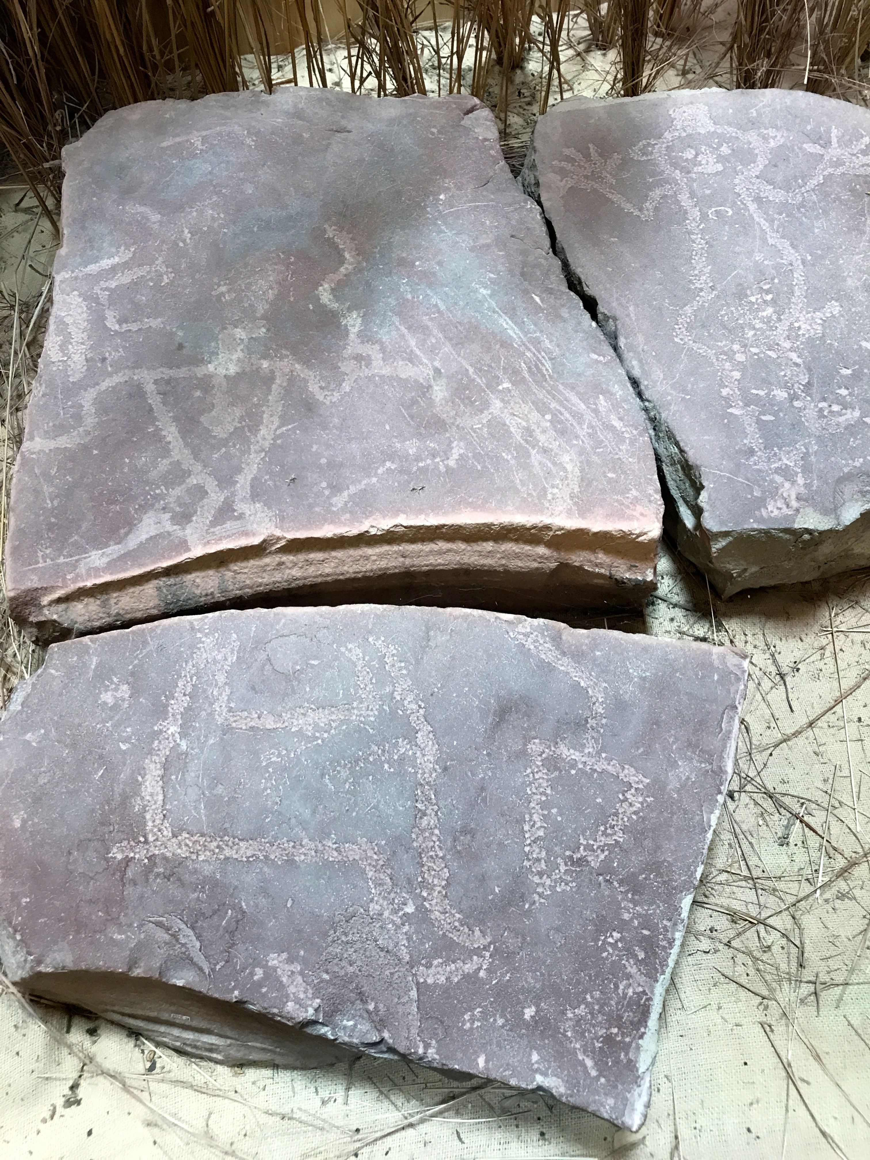 According to the information with them, in the late 1880s, the petroglyphs were removed form the quartzite bedrock surround the Three Maidens.