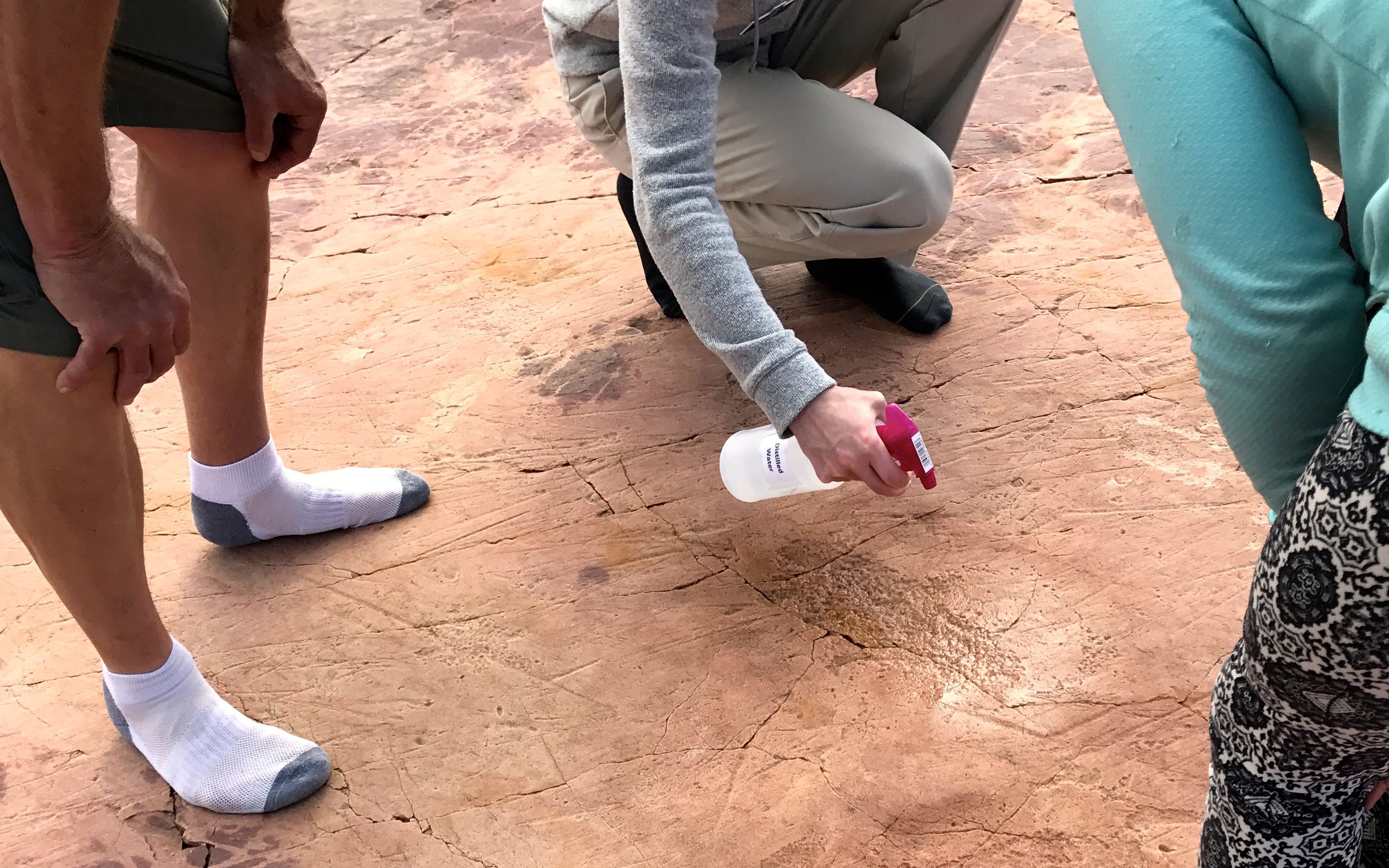 Spraying the rocks help to make the petroglyphs more easy to detect.