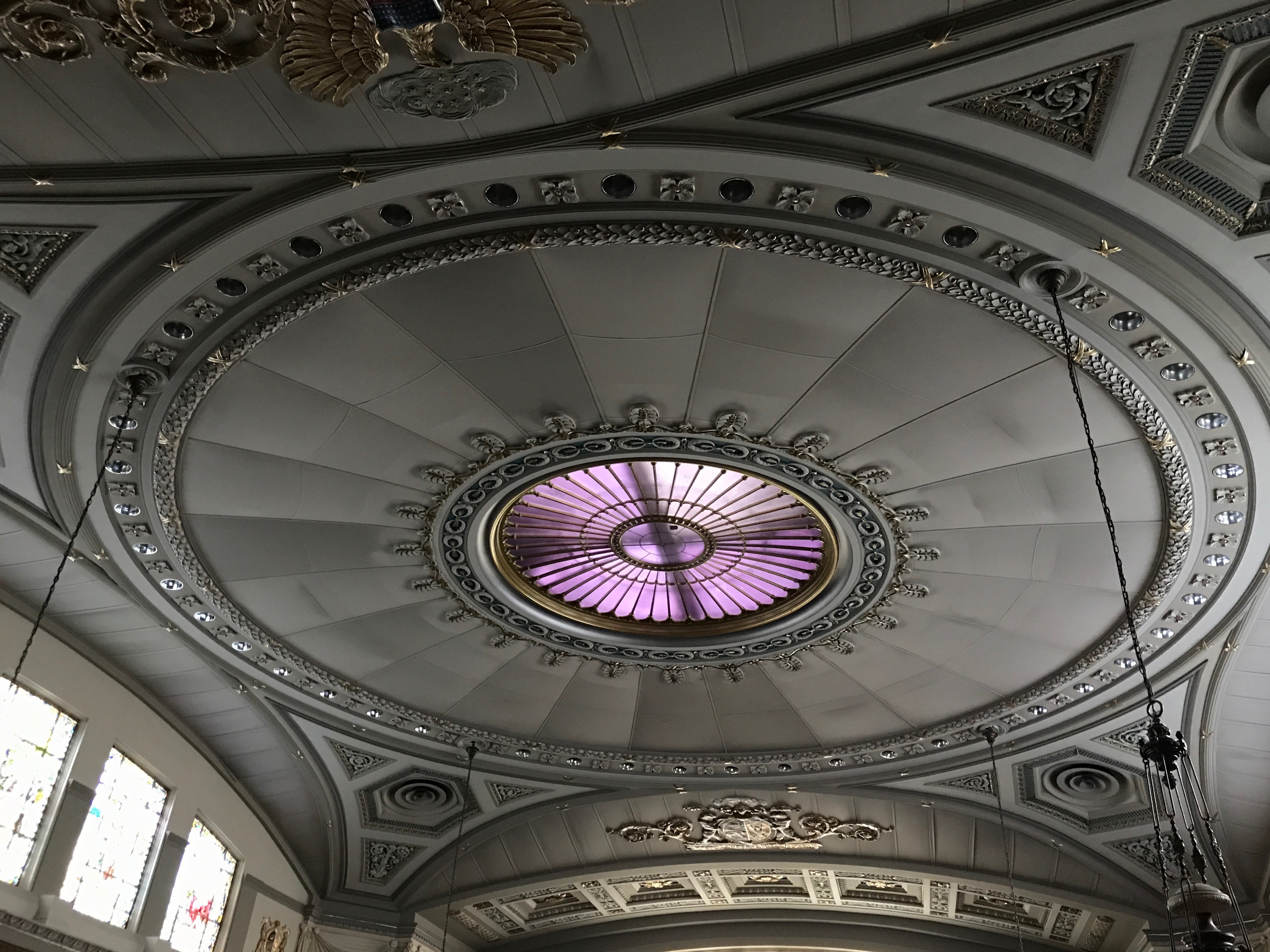 The ceiling has a beautiful piece of leaded glass in it. I’m not sure why it’s purple, but there you have it.
