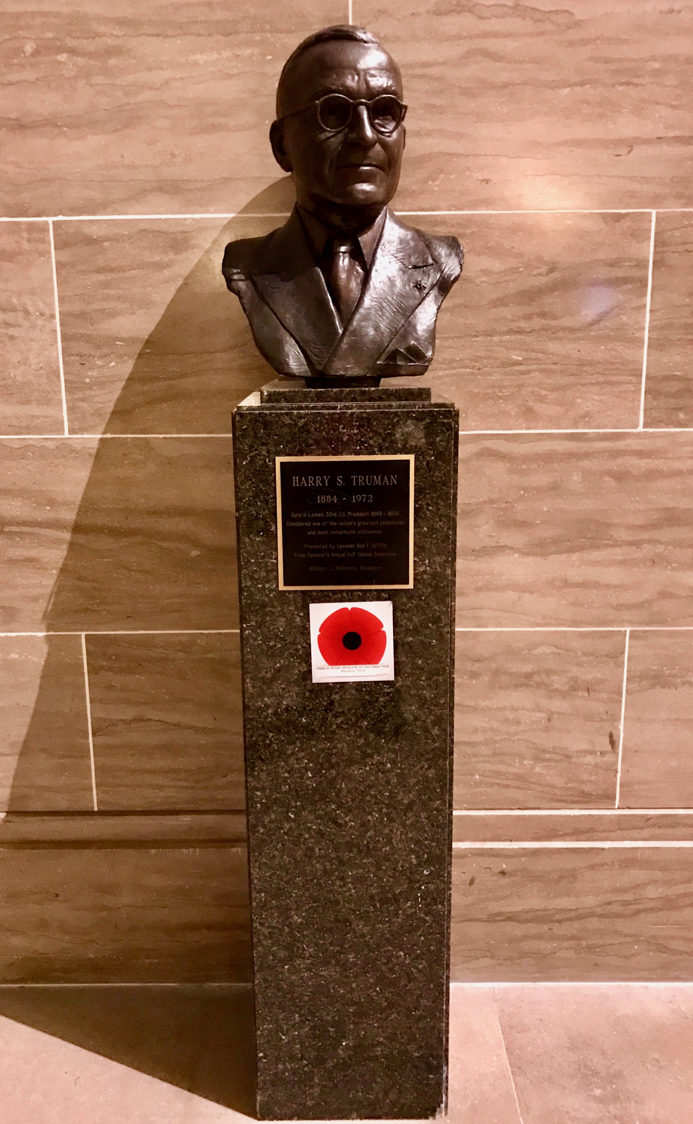 I am including this photo of his bust on the pedestal so that you can see the poppy on it. Truman served in WW I, which he only managed to get into because he secretly memorized the eye chart to compensate for his poor vision. My visit to the capitol was in 2018, which was the 100th anniversary of the end of WW I. The poppy is the symbol of remembrance. I believe it gained popularity because of the poem “In Flanders Fields” by John McCrae.