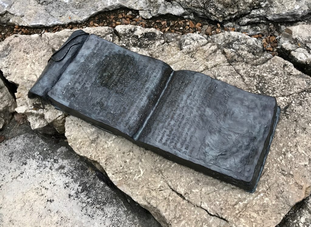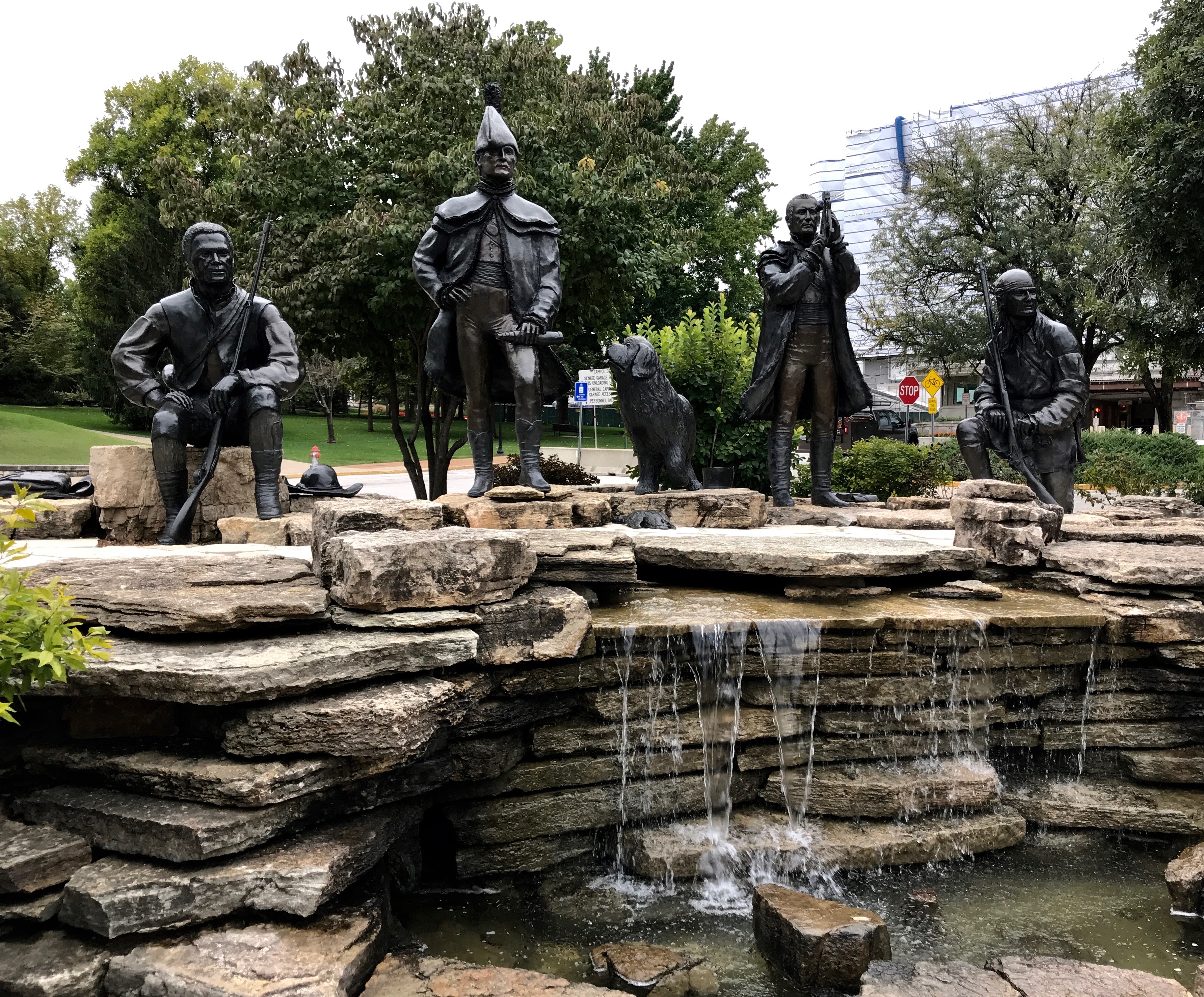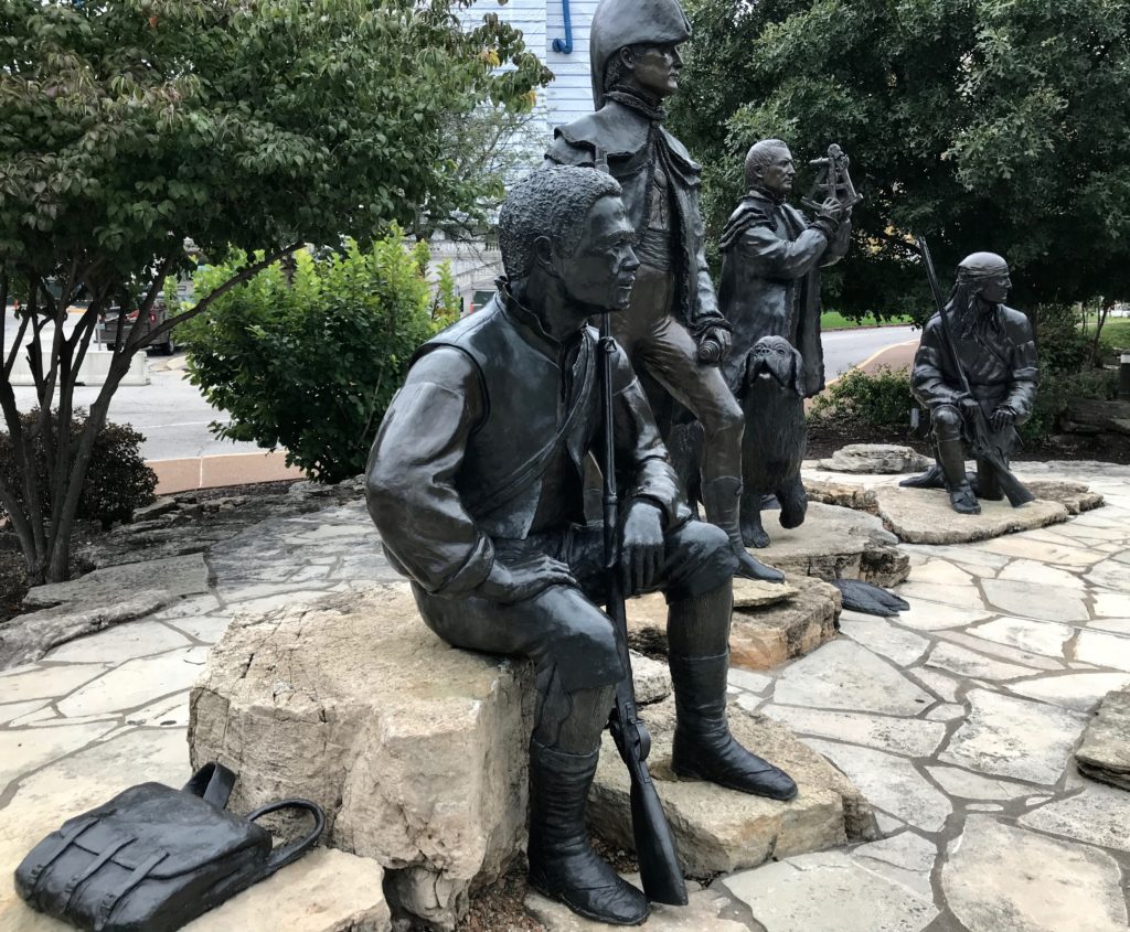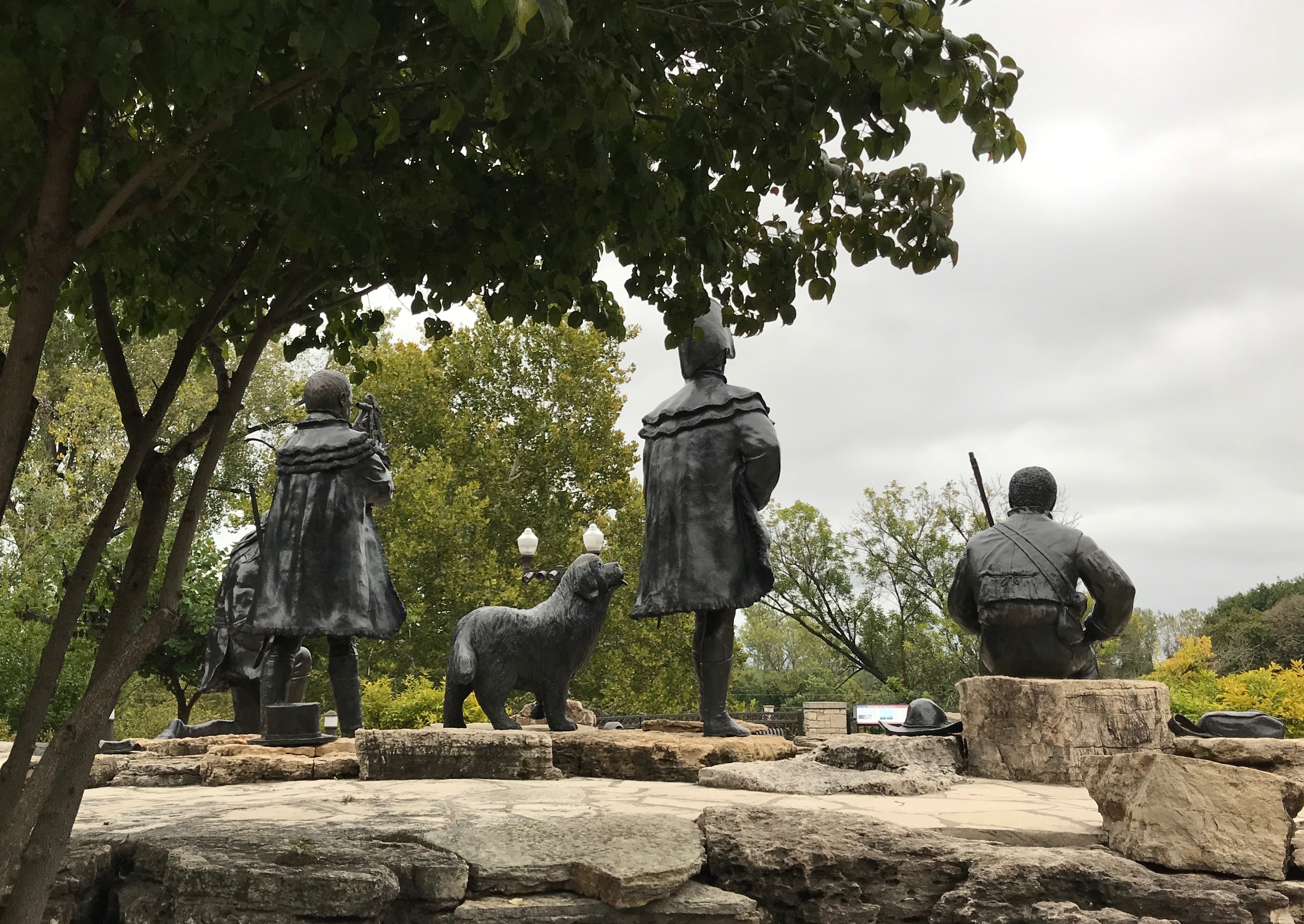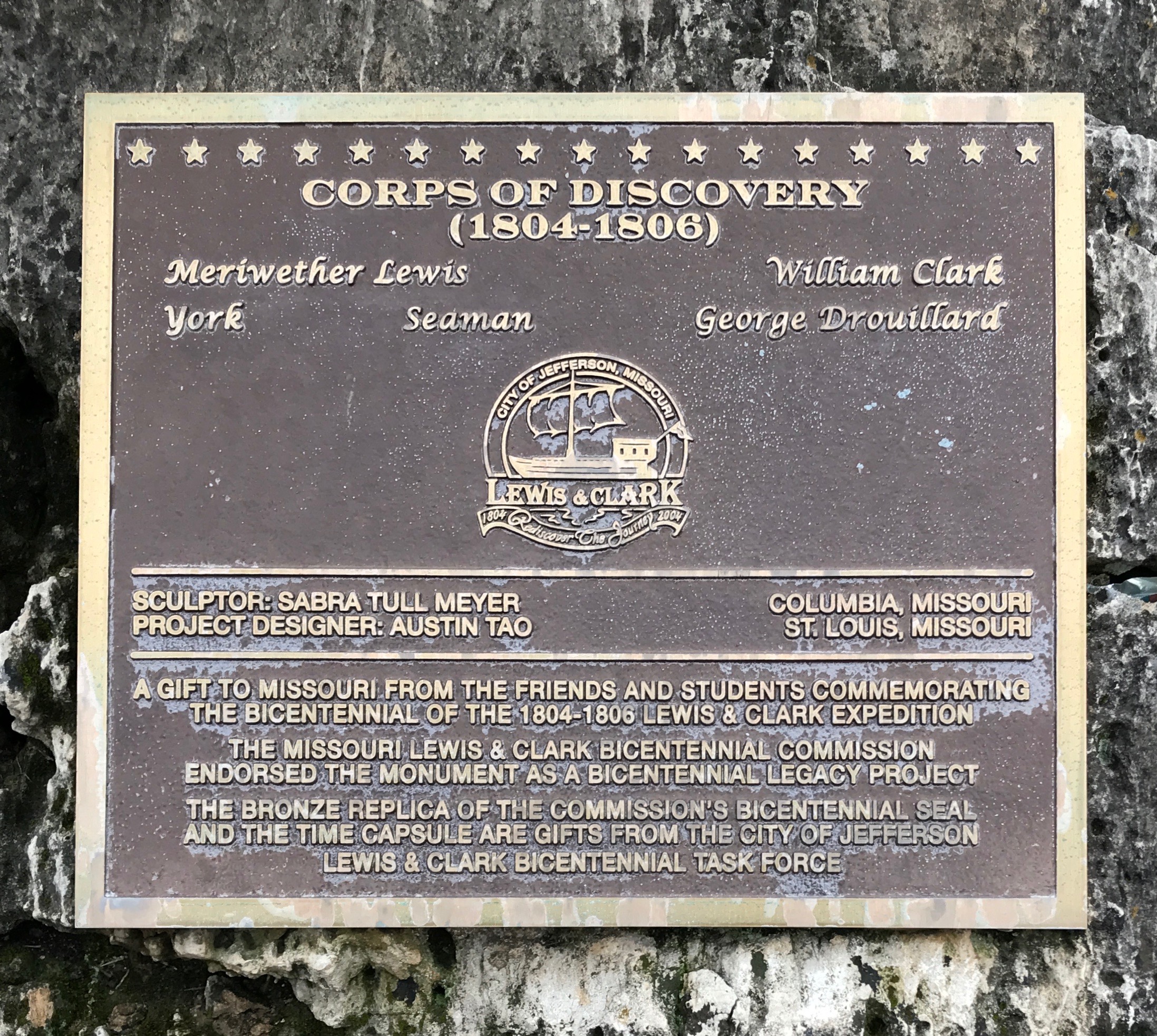 This monument depicts a specific day in the historic journey of the Corps of Discovery. According to a marker at the site, “…on June 4, 1804, a keelboat and two pirogues containing the members of the Corps of Discovery passed this spot as they headed upstream to the headwaters of the Missouri River and across the Rocky Mountains to the Pacific Ocean. The Lewis and Clark Expedition was in the twenty-second day of their two-year, four month long odyssey. Already fighting the strong currents of the Missouri River, the party had managed to cover over 145 miles since leaving their winter encampment at the River DuBois, in present day Illinois. The expedition still had 3,855 hard miles stretching ahead before they reached their destination on the western rim of the continent.”