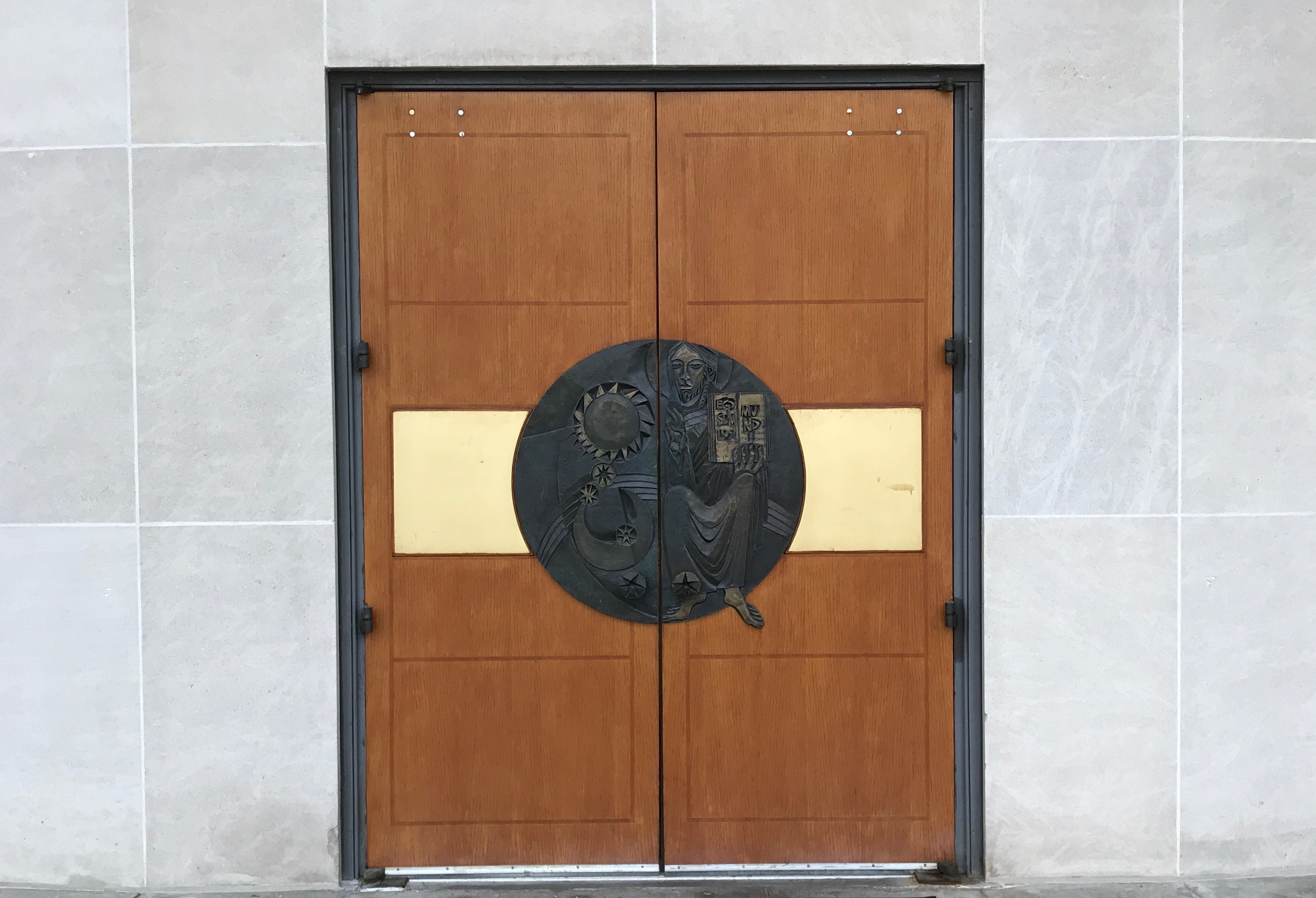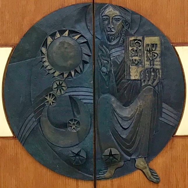 The bronze medallion embedded in the center set of doors depicts an eternal Christ. He is seated among the sun, moon, stars and rainbows of the heavens. With one hand, the figure makes the ancient gesture of a teacher.