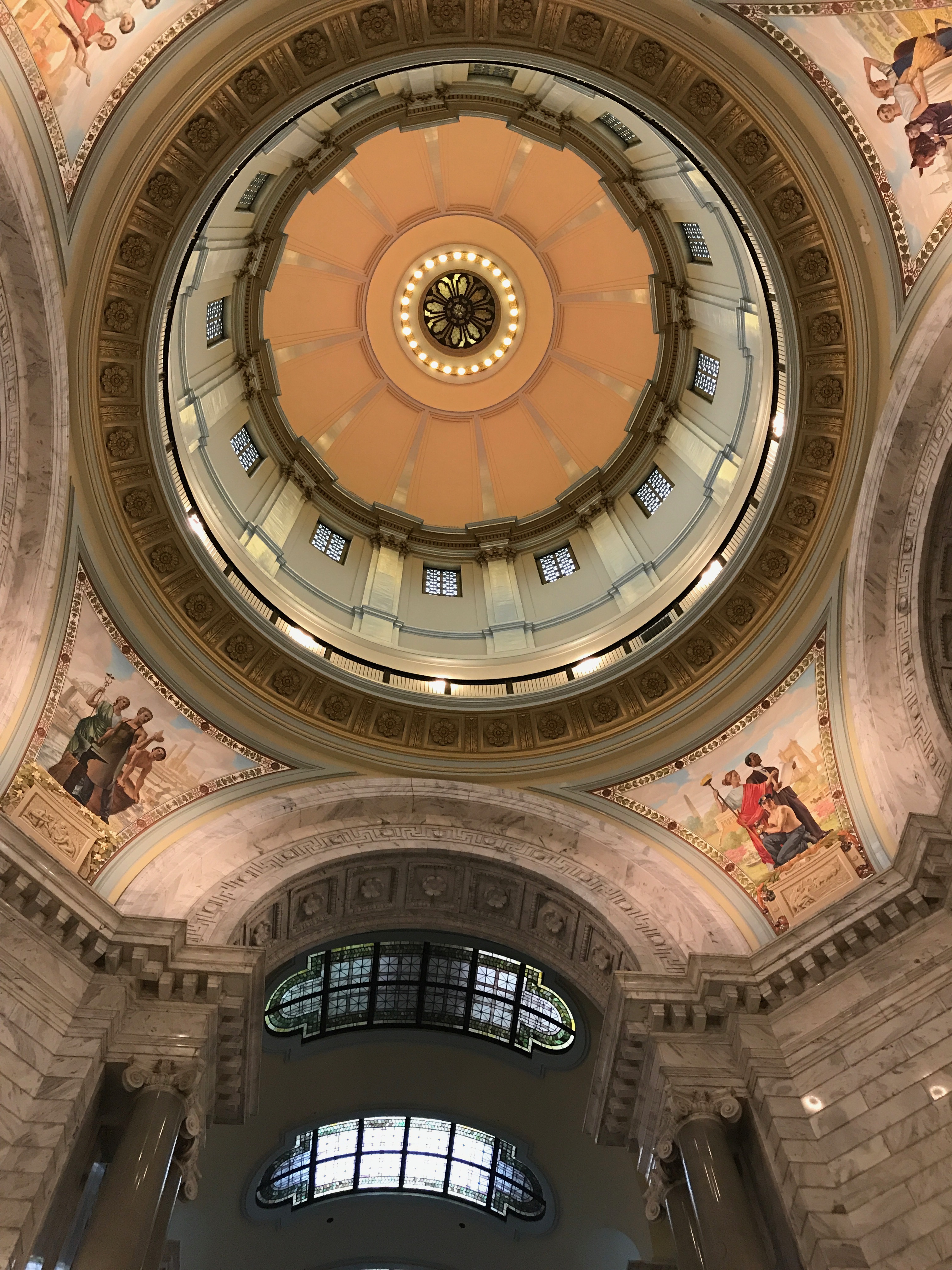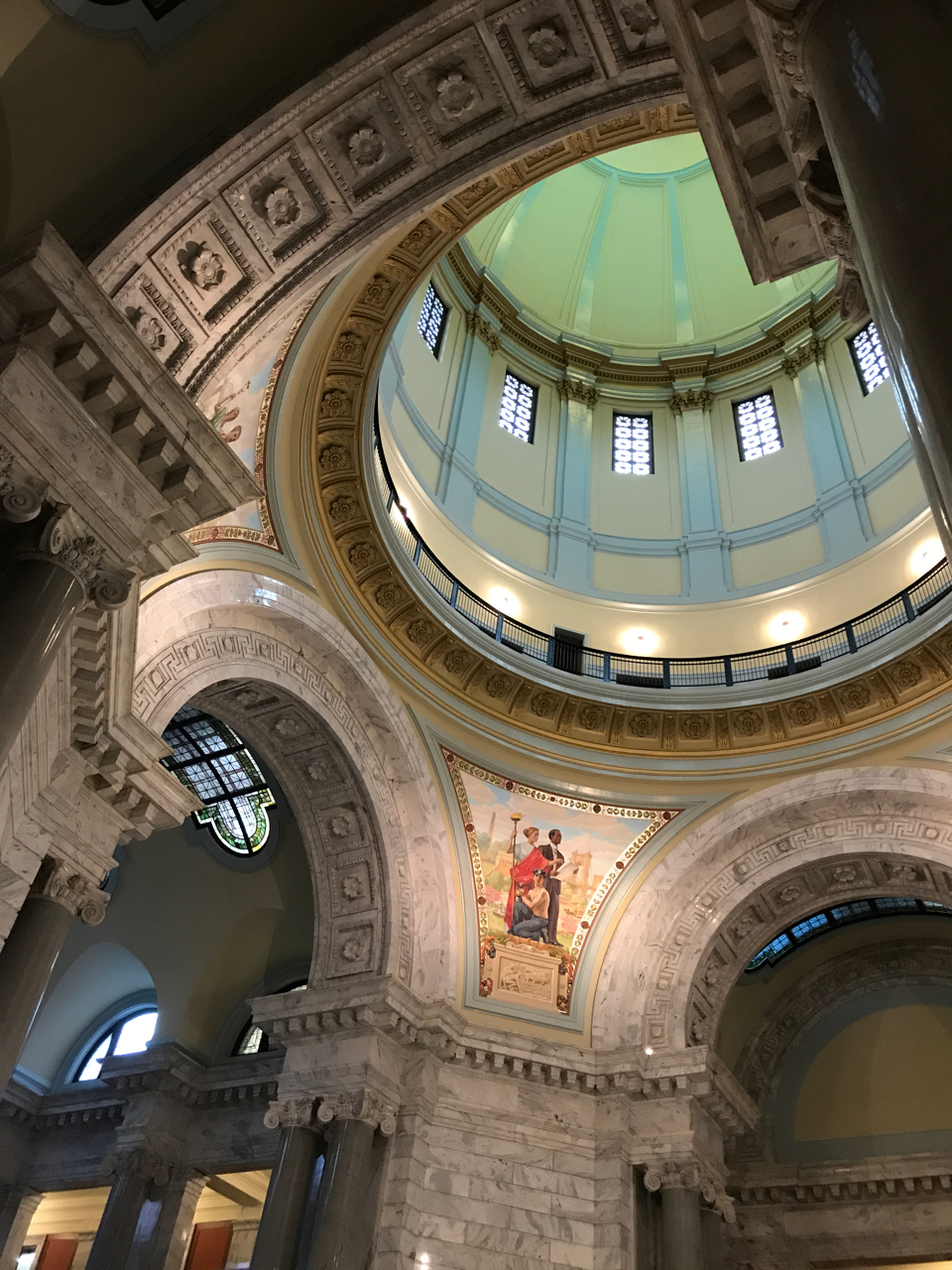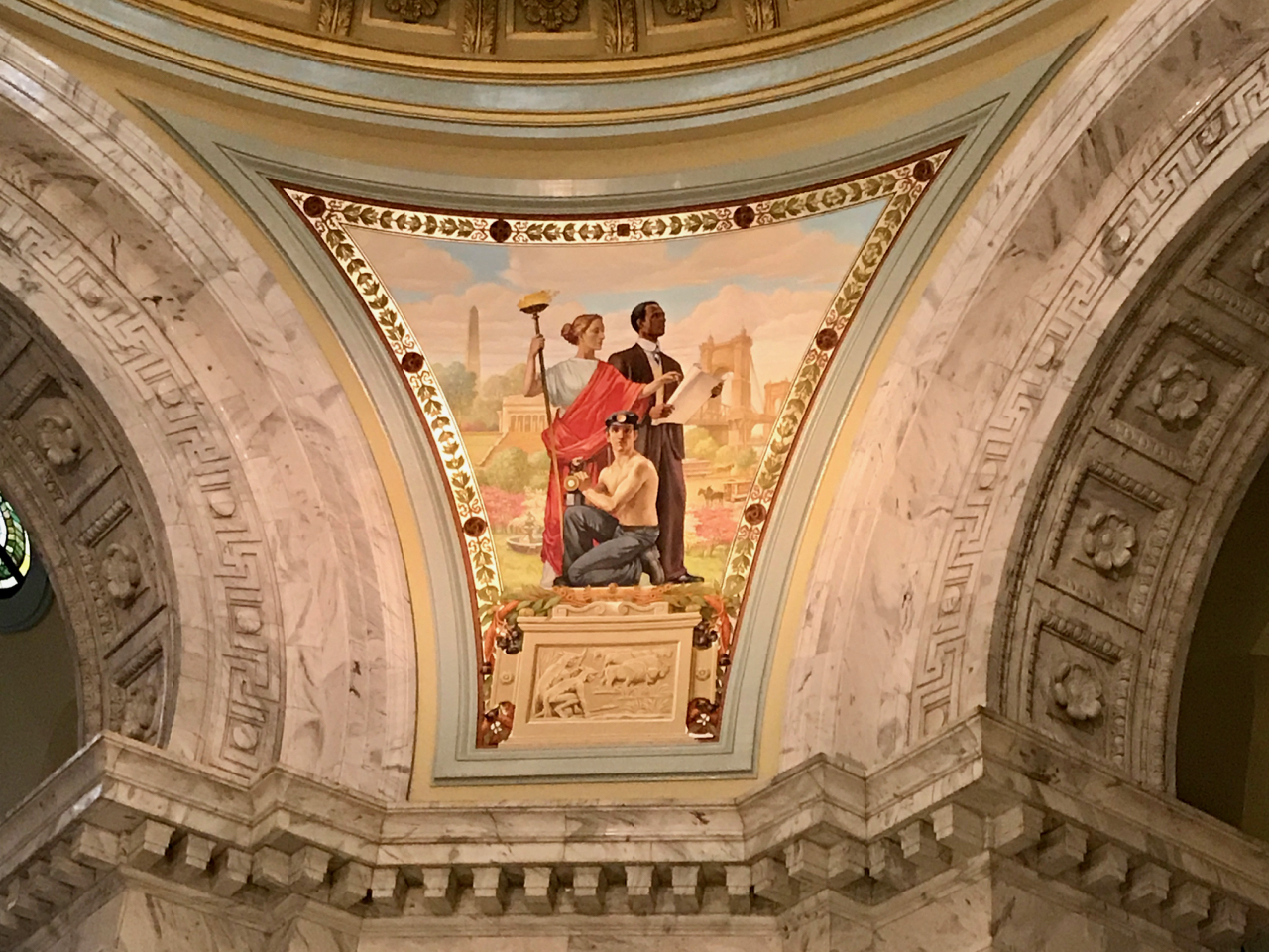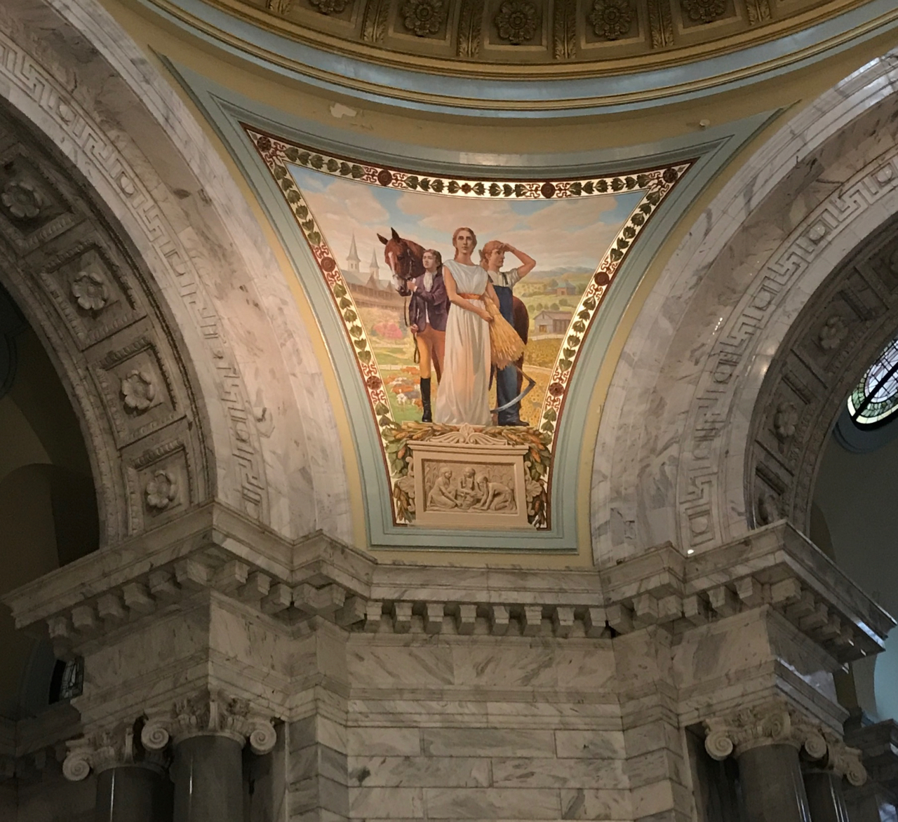 The Kentucky Capitol Centennial Commission selected the rotunda pendentive murals as the legacy project for the 100th anniversary of the capitol. Just in case you are wondering about the word “pendentive,” it refers to those triangular shapes that permit placing a circular dome over a square room.