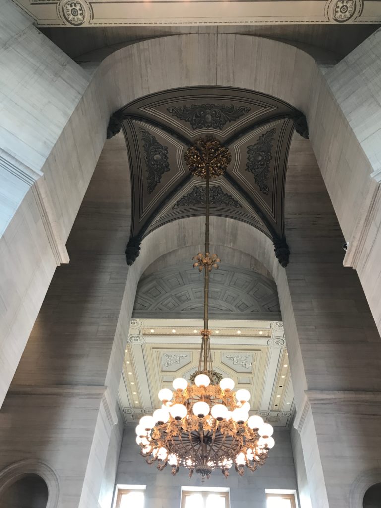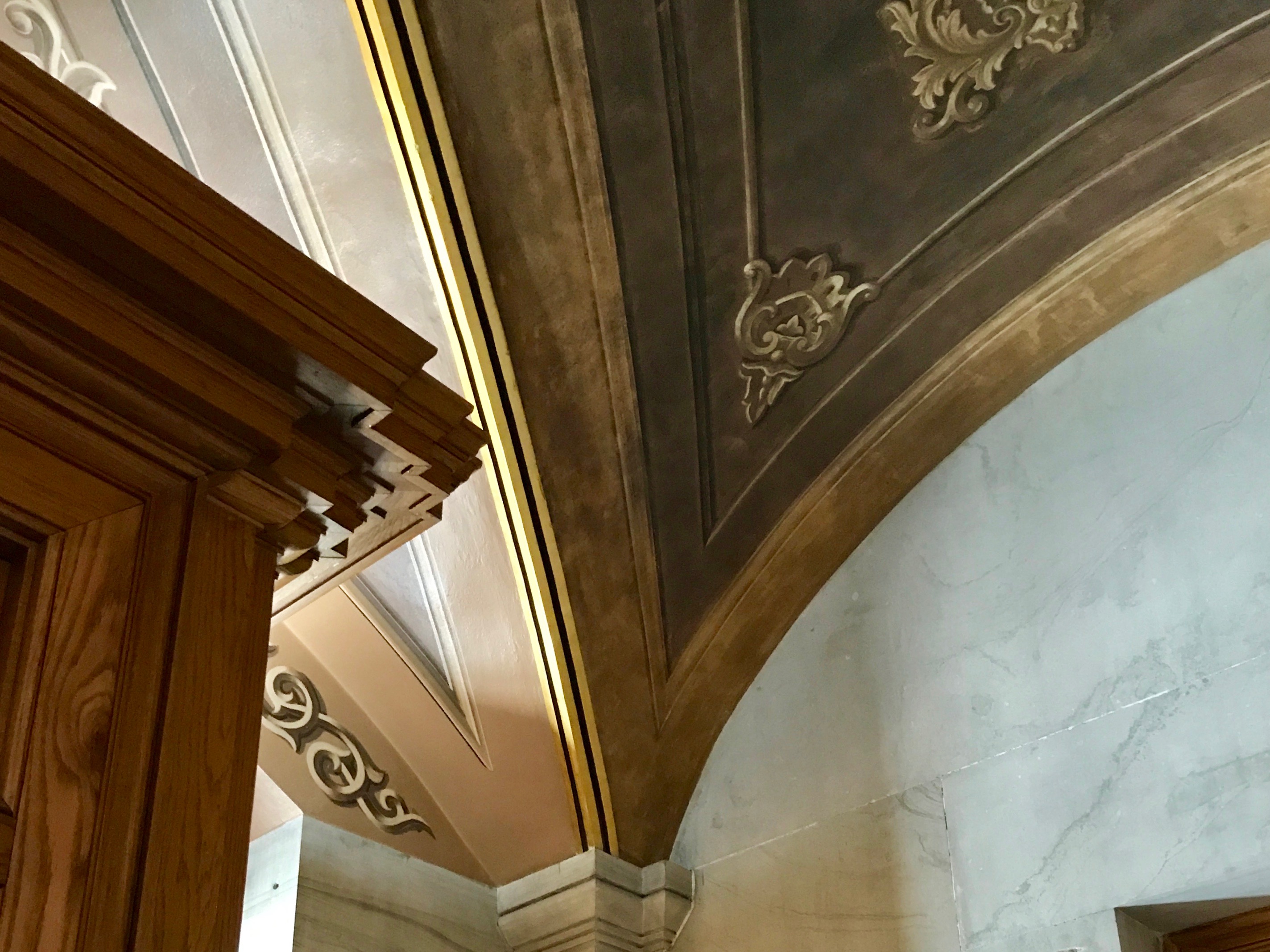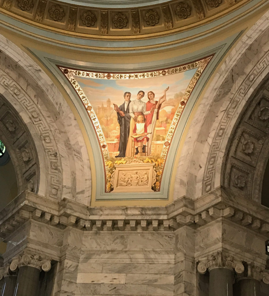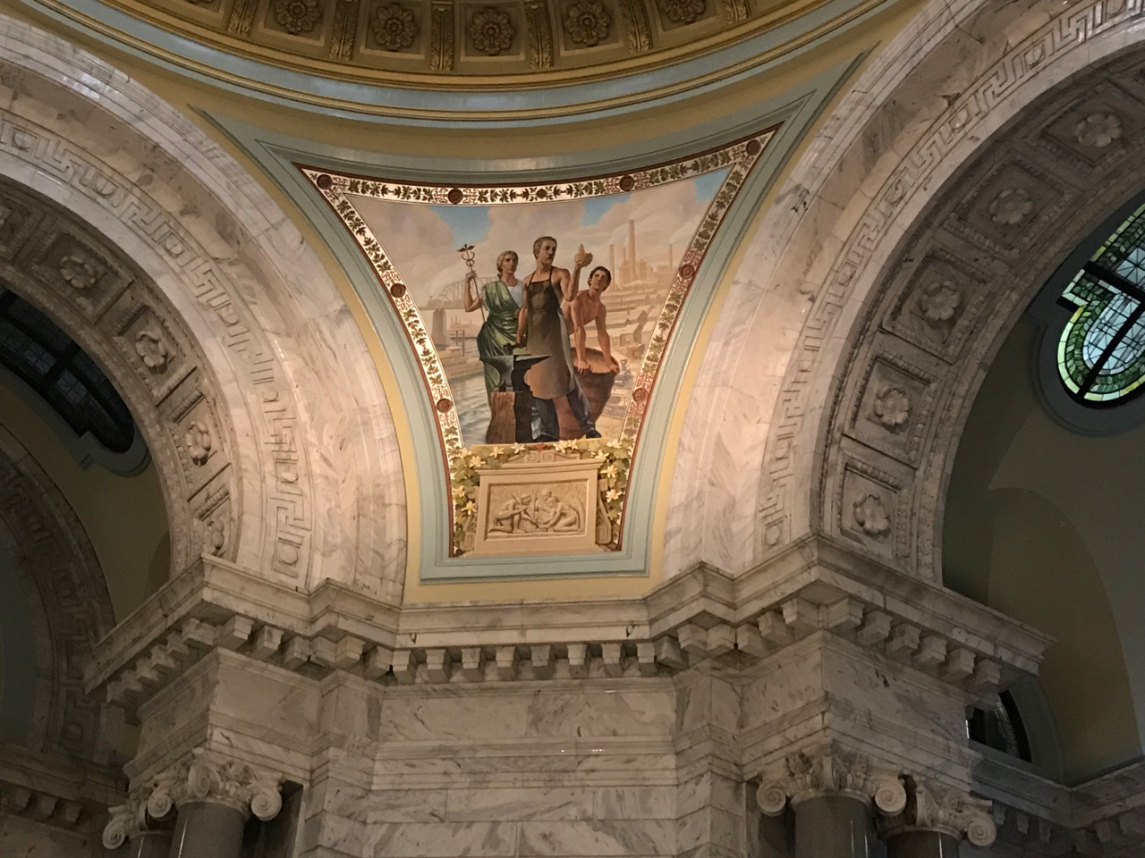 The Kentucky Capitol Centennial Commission selected the rotunda pendentive murals as the legacy project for the 100th anniversary of the capitol. Just in case you are wondering about the word “pendentive,” it refers to those triangular shapes that permit placing a circular dome over a square room.