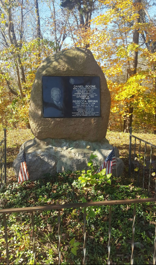 While there is no dispute that Rebecca’s remains are here, there is a question as to whether they dug up Daniel’s remains. Rebecca predeceased Daniel by seven years. When they were ready to bury Daniel, the spot next to Rebecca had someone else in it, so they buried him at her feet. So, they aren’t quite certain is Daniel is here or if he got left behind in Marthasville, Missouri. If you are in the St. Louis area, and you want to go looking for where Daniel Boone’s remains might…remain, just go to Google Maps and put in Old Bryan Farm Cemetery, and it will take you right there.