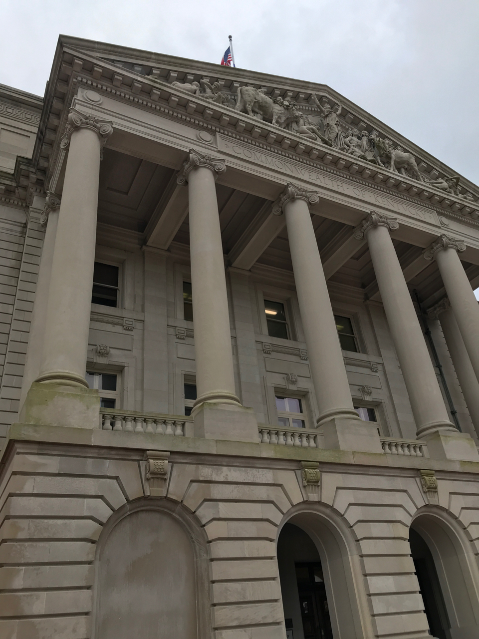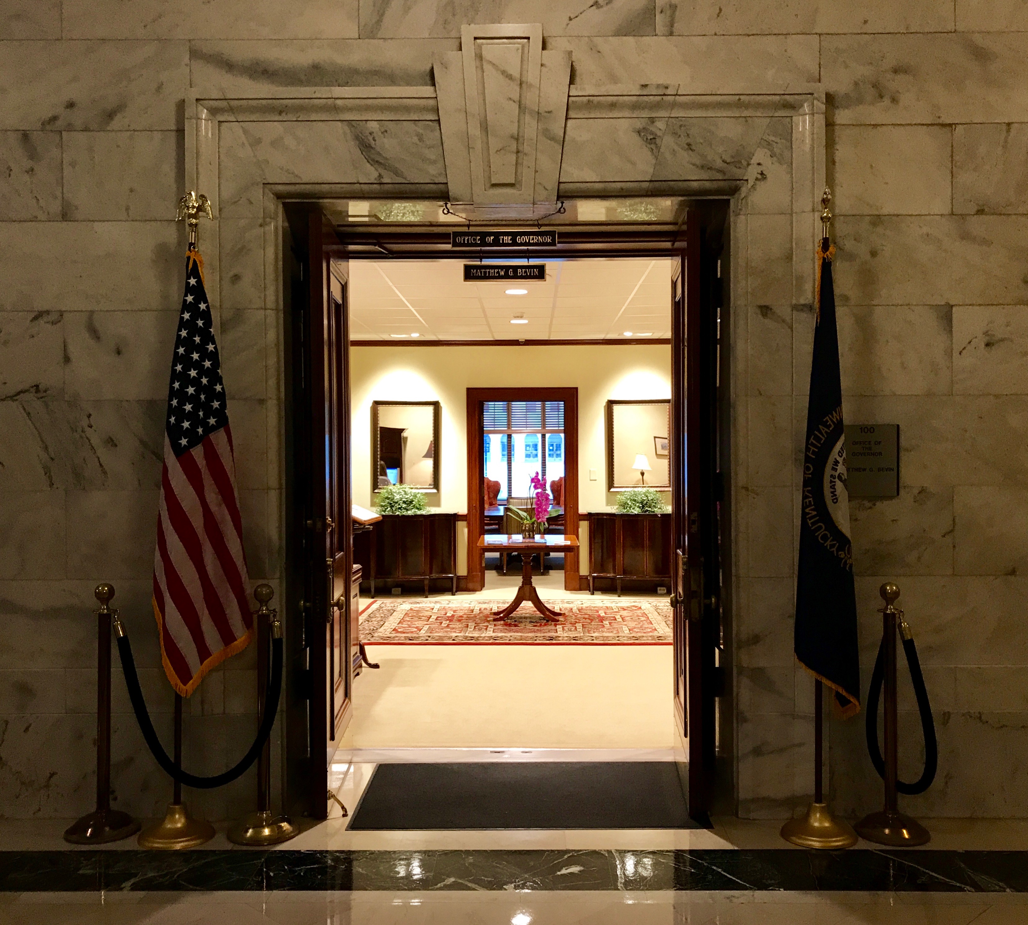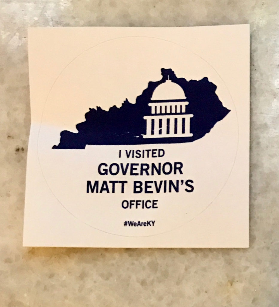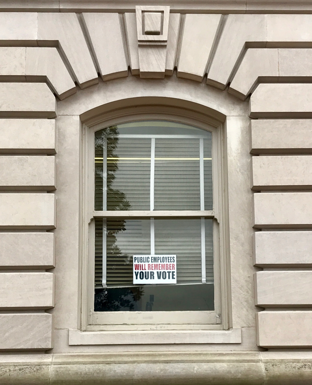 I saw this sign posted in a window as I walked around the building. I wonder if there is a connection to Bevin’s ouster and public employees?