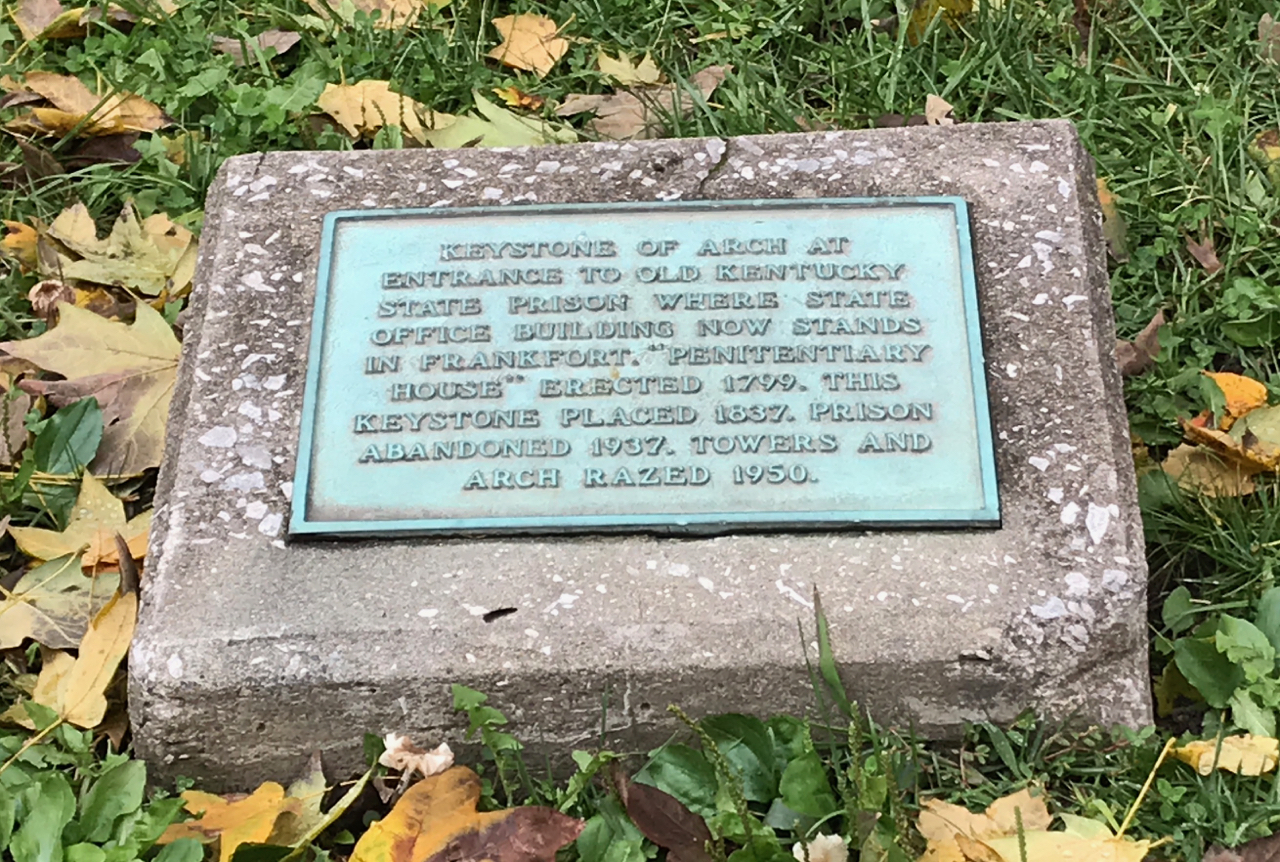Now, I’m not 100% certain, but I think this is the keystone of the arch at the entrance to the Old Kentucky State Prison. According to a plaque nearby, the “penitentiary house” was erected in 1799, and the keystone was place in 1837. The prison was abandoned in 1937 and the towers and the arch were razed in 1950. The State Office Building in Frankfort now stands on the site it once occupied.