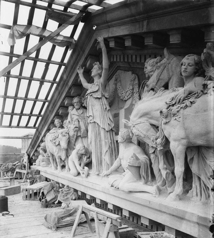 This historic photo, from the same source, gives you an idea of the monumental scale of the sculptures.
