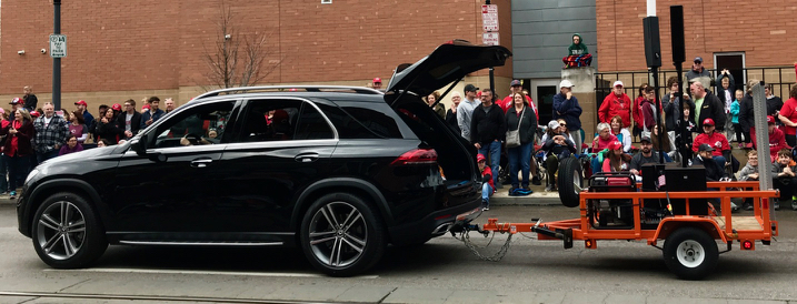 Not being from Cincinnati or a baseball aficionado, I had to look up this Reds mascot. Here we have Gapper riding a three-wheeled motorcycle on a two-wheeled trailer.