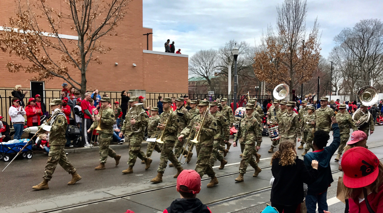 You might have to look really hard to find the marching band in this photo. After all, they are wearing camouflage.