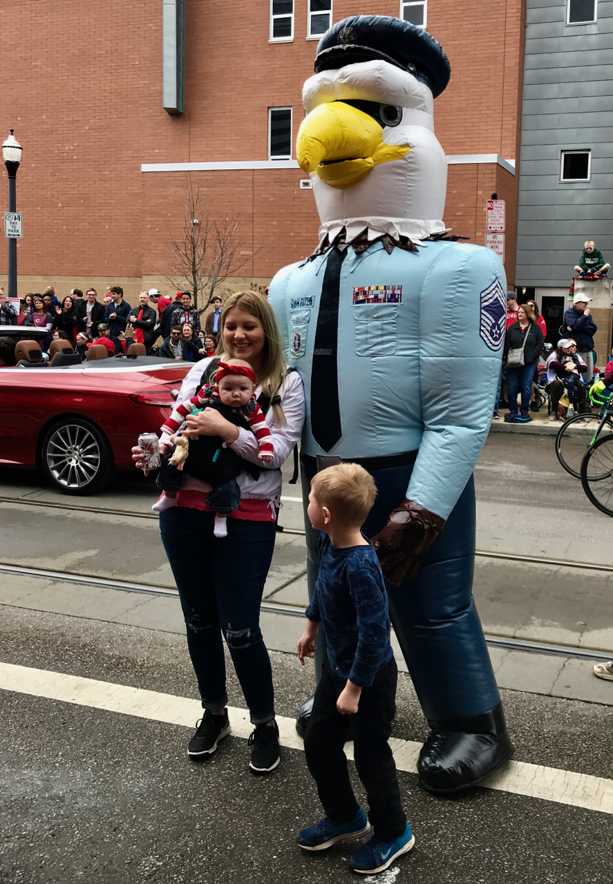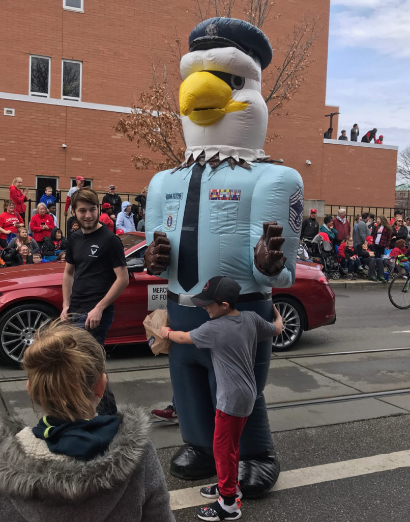 Now, this is something I’ve never seen in a parade before – a marching inflatable. This inflated Air Force eagle had a handler who helped him navigate and steer clear of obstacles.