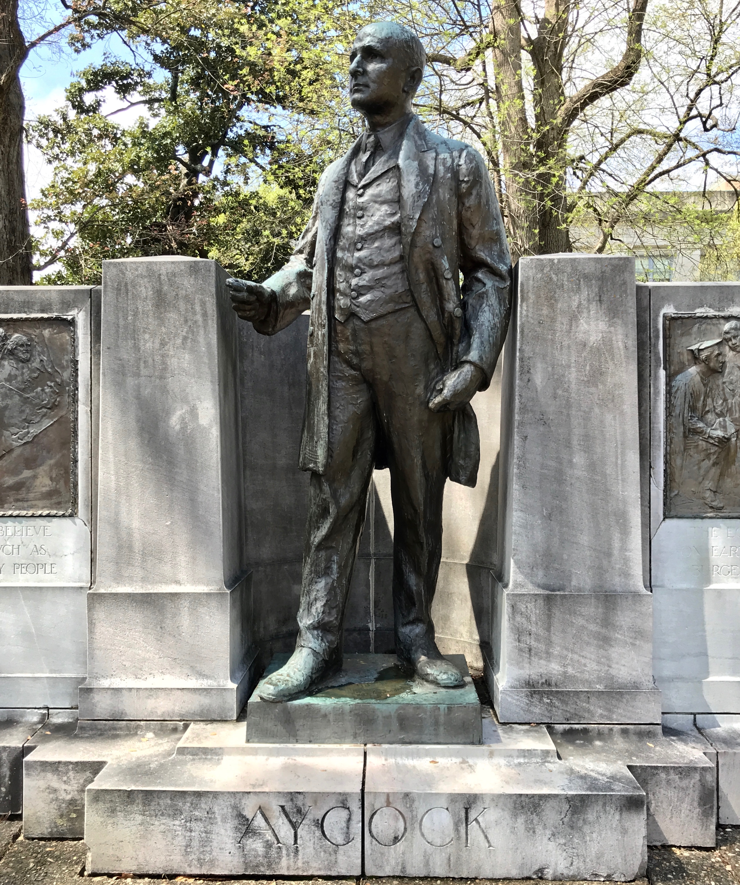Here we have another governor memorial. Charles Brantley Aycock was North Carolina’s 50th Governor, and he served from 1901 to 1905. He was a strong proponent of the white supremacy campaigns of that period and was one of the leading perpetrators of the Wilmington Insurrection or 1898, in which whites took over the city government by force, the only successful coup d’état in U.S. history.