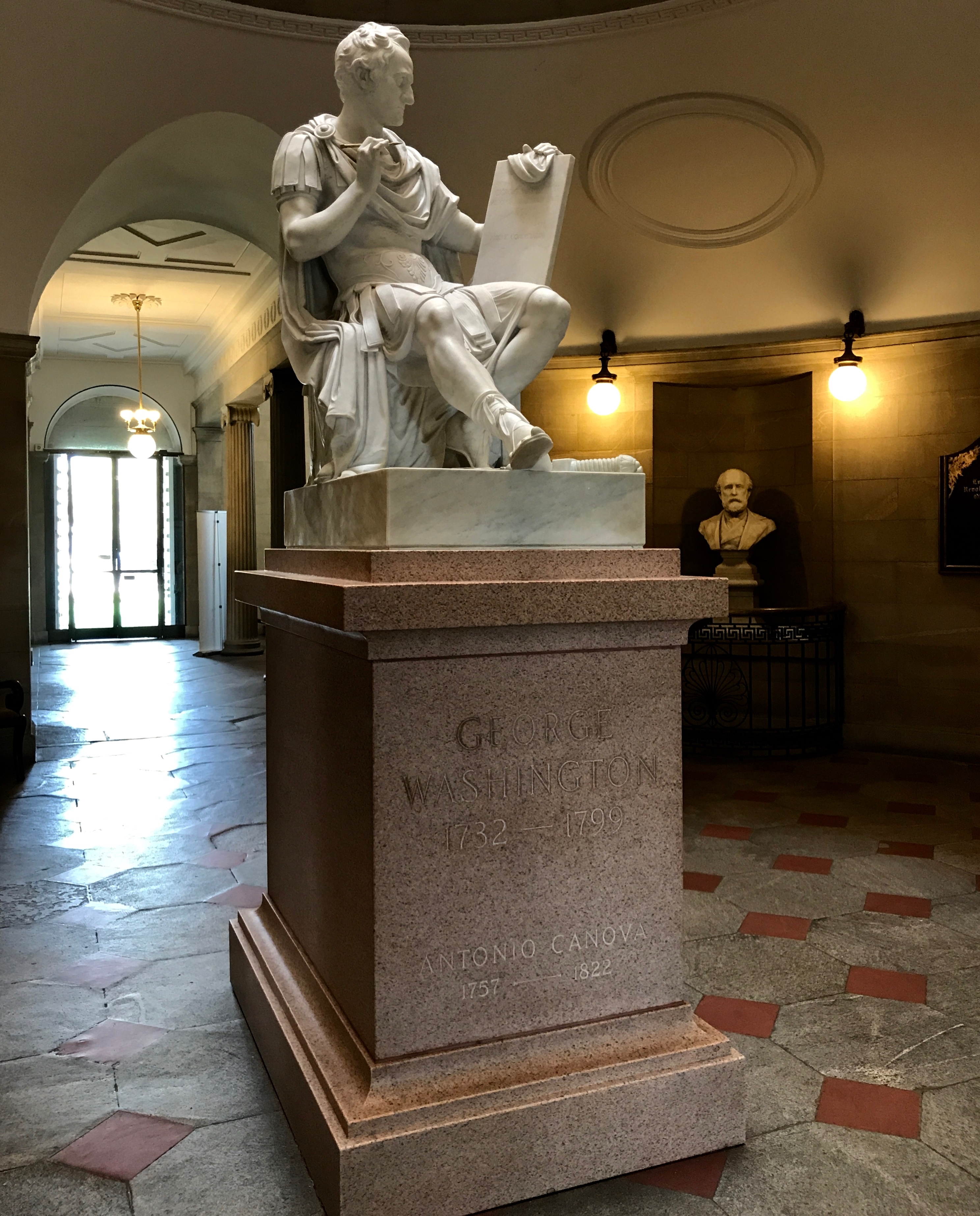 Even more interesting is the history of it. It was commissioned in 1815, sixteen years after Washington’s death. Thomas Jefferson decided that Antonio Canova should be the sculptor and that Thomas Appleton, American consul in Livorno, Italy should handle the negotiations. I suspect that part of the reason for selecting Appleton might have something to do with the fact that he owned a plaster copy of the marble bust of Washington by Guiseppe Ceracchi that Jefferson recommended as a model for the head.