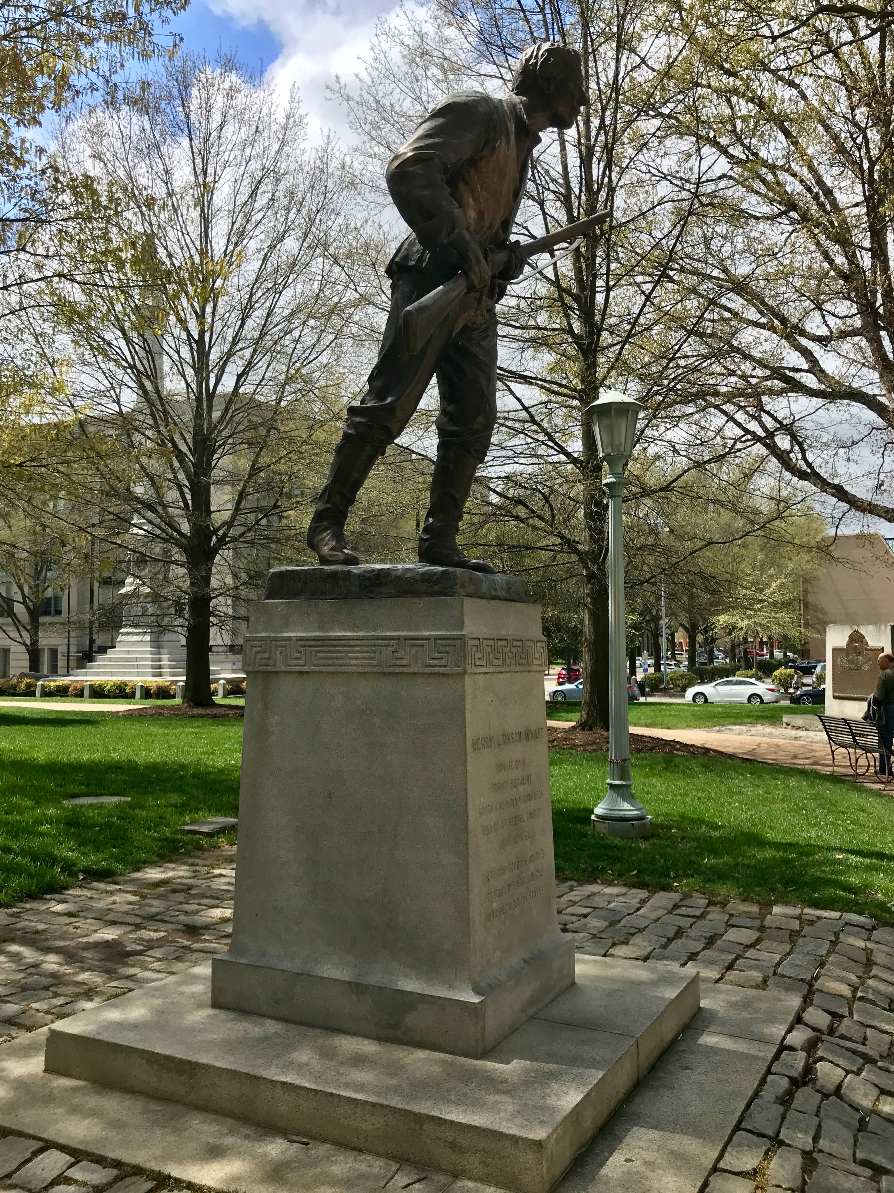 This statue is of Henry Lawson Wyatt. He died in the Battle of Big Bethel, one of the first skirmishes of the Civil War, making him the first enlisted soldier from North Carolina to die in battle.