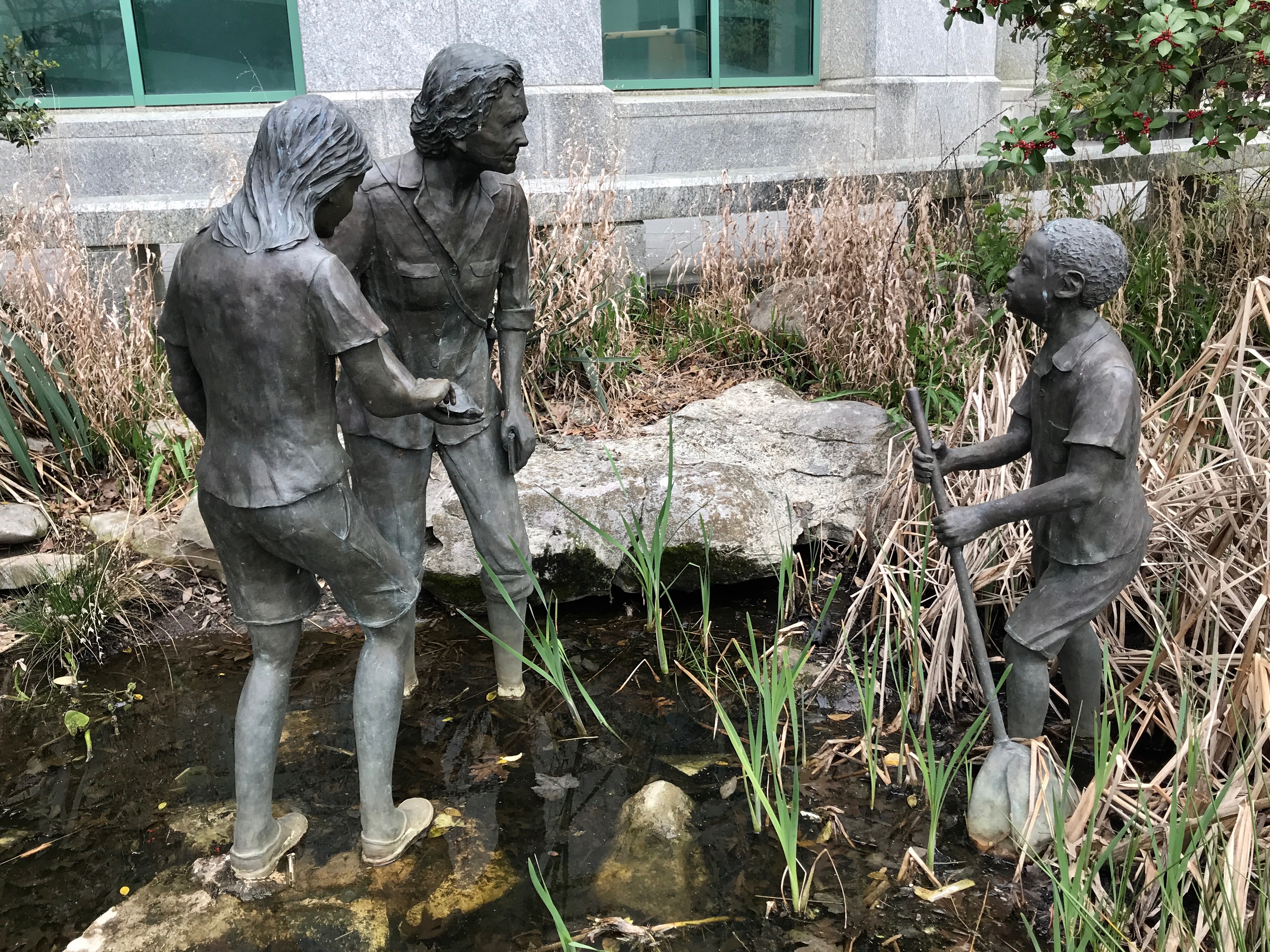 This statue grouping in front of the North Carolina Museum of Natural Sciences shows Rachel Carson sharing the wonders of the natural world with children.