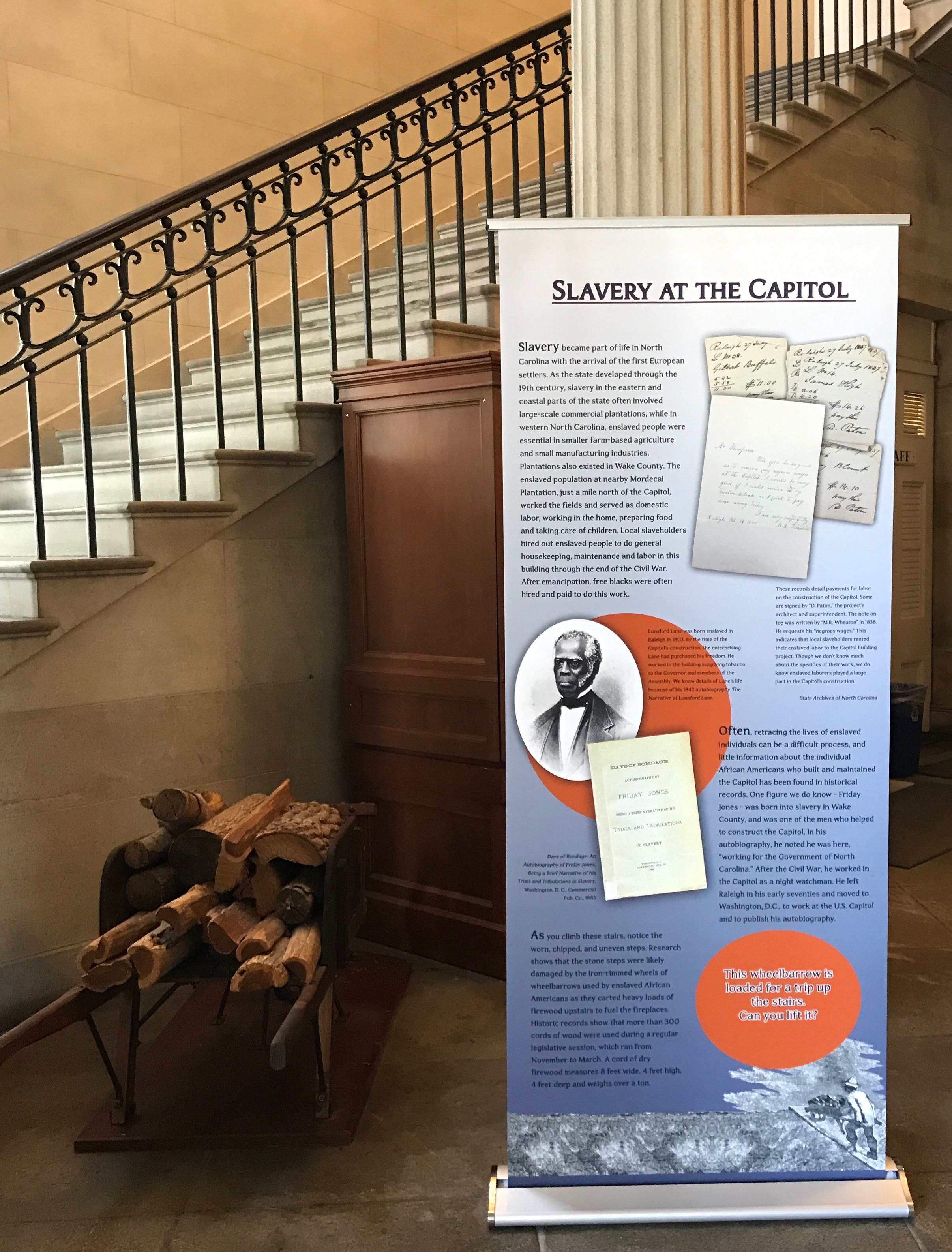The portrait on the banner is of a person who did not help build the Capitol. This is because Lunsford Lane had purchase his freedom by the time the Capitol was under construction.