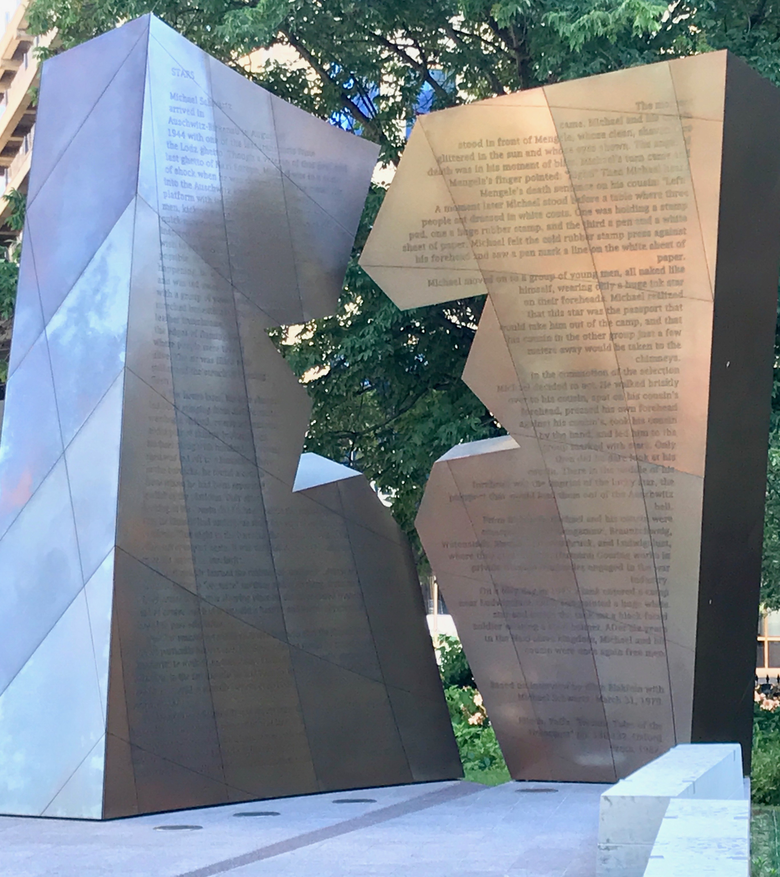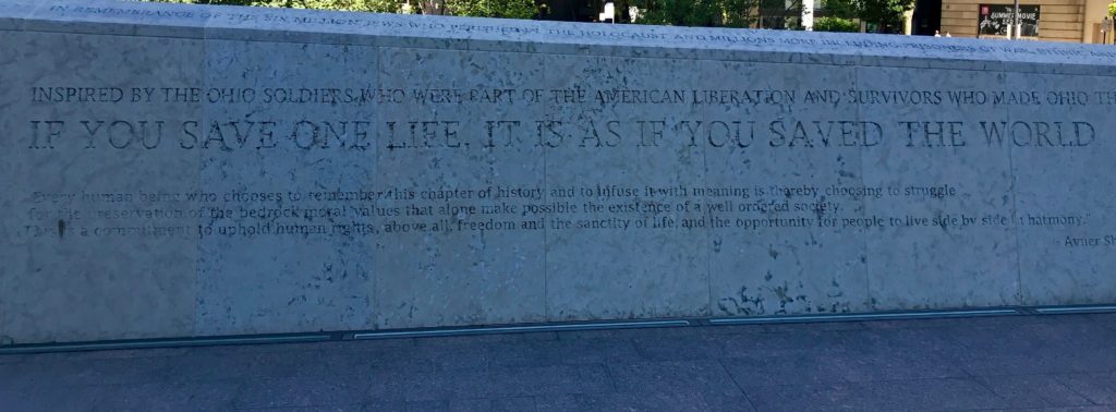 I came upon the Ohio Holocaust and Liberators Memorial. It was unveiled in 2014 by Governor John Kasich and architect Daniel Libeskind. According to the website, “The memorial speaks for the millions of voices the Holocaust silenced and thanks the brave men and women of Ohio who liberated the oppressed and fought for human freedom during the Second World War.”