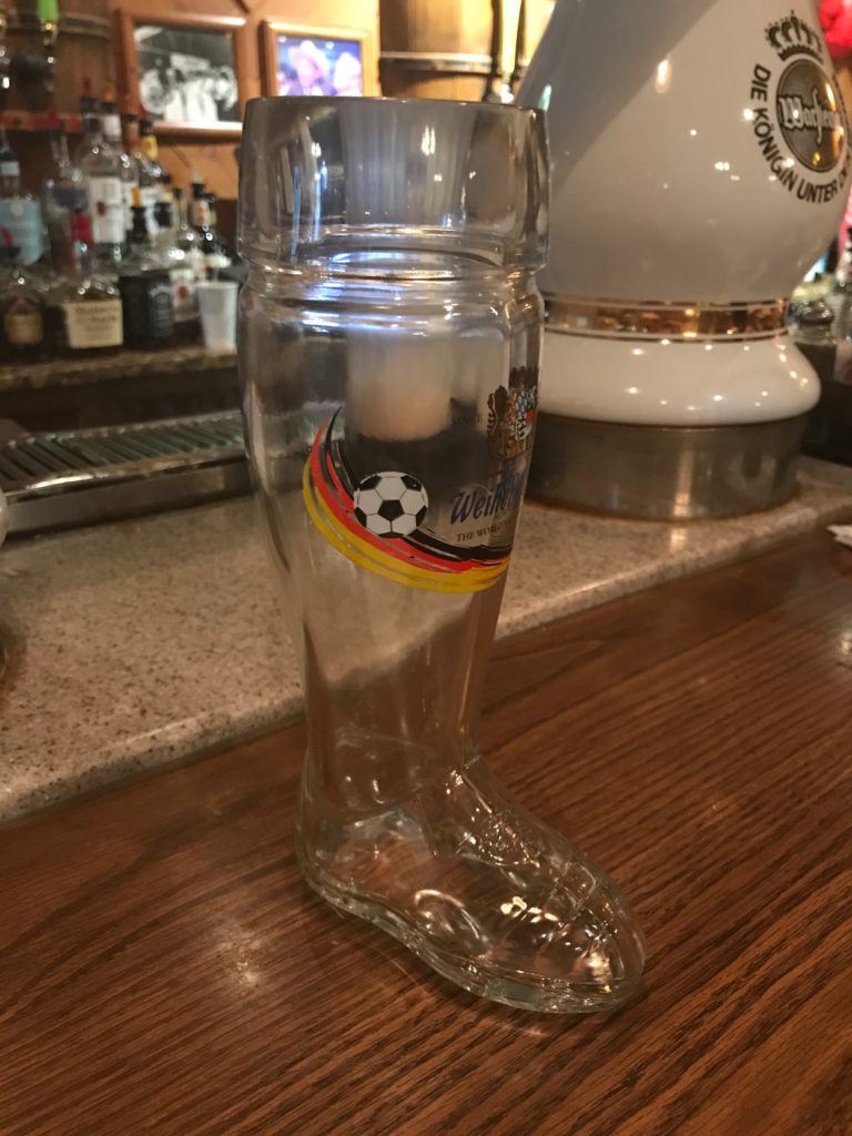 “Beer boots (or Bierstiefel) have over a century of history and culture behind them. It is commonly believed that a general somewhere promised his troops to drink beer from his boot if they were successful in battle. When the troops prevailed, the general had a glassmaker fashion a boot from glass to fulfill his promise without tasting his own feet and to avoid spoiling the beer in his leather boot. Since then, soldiers have enjoyed toasting to their victories with a beer boot. At gatherings in Germany, Austria and Switzerland, beer boots are often passed among the guests for a festive drinking challenge. Since the movie Beerfest appeared in 2006, beer boots have become increasingly popular in the United States.”