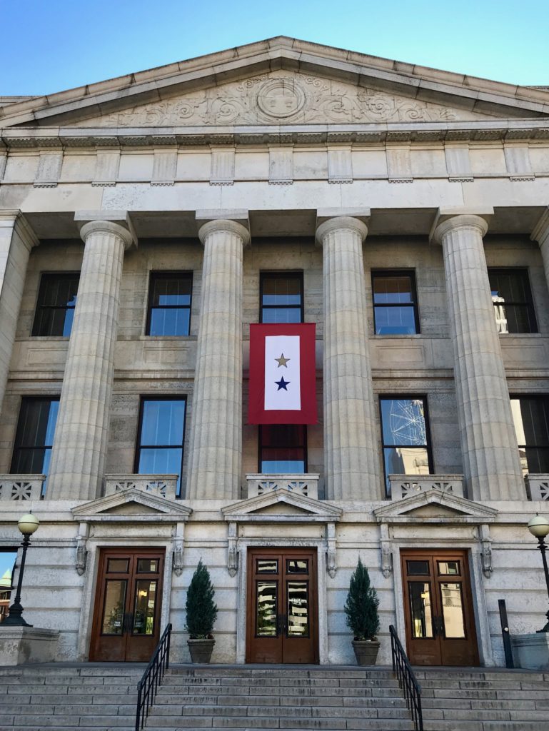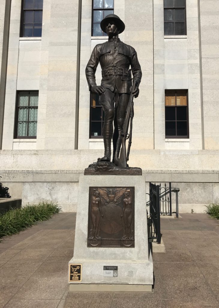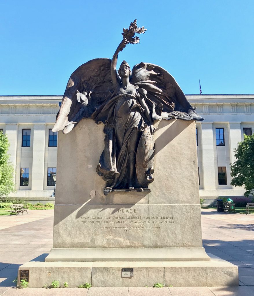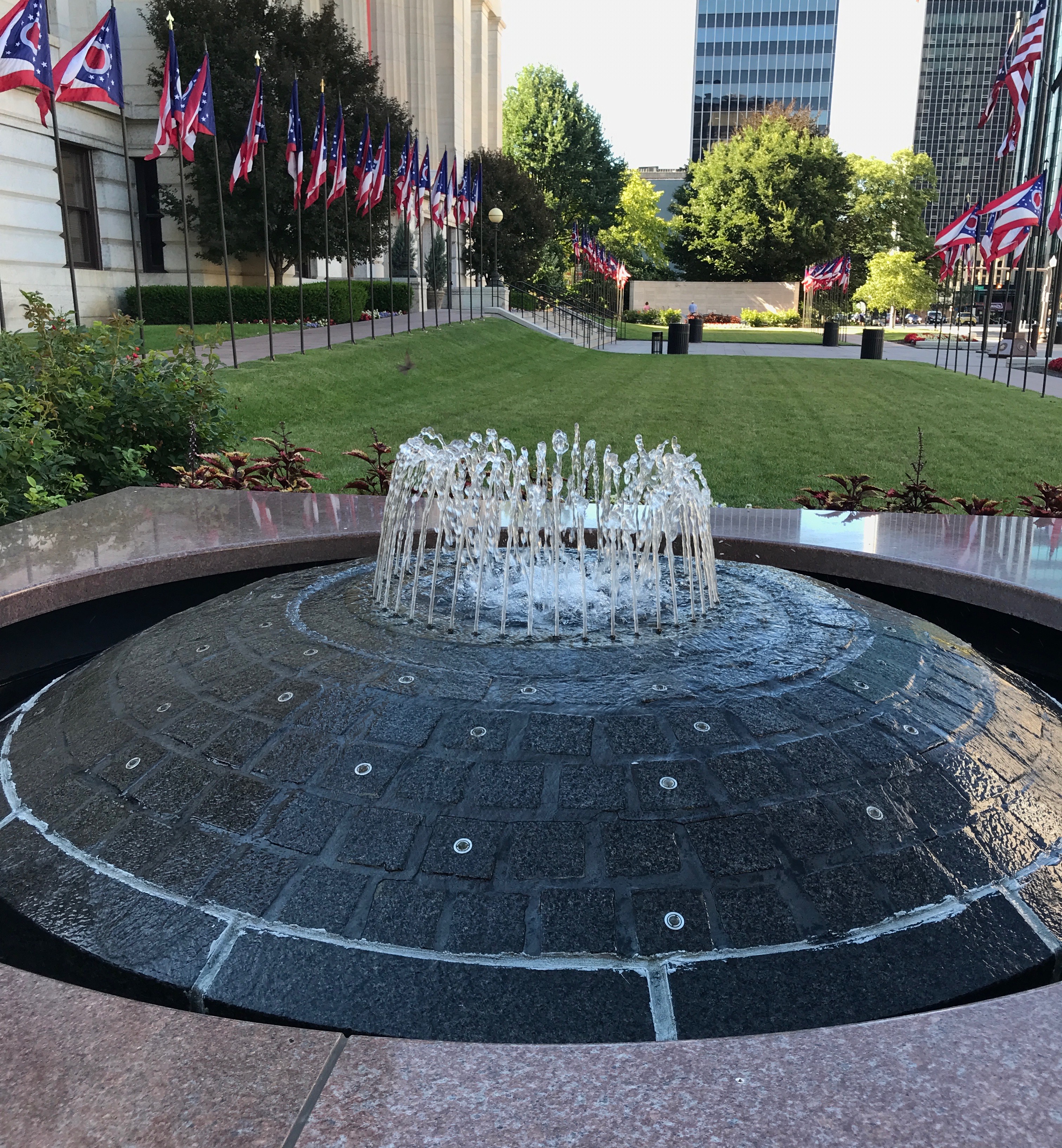 In front of the east façade is the Ohio Veterans Plaza. According to the website, “The inspiration for the Ohio Veterans Plaza is rooted in an act of civil disobedience. In 1981, two Vietnam veterans, Carl Chandler and Harry Edwards, erected under the cover of night on the Capitol grounds a hand painted four-by-eight-foot sheet of plywood as a tribute to veterans of the Vietnam War.”